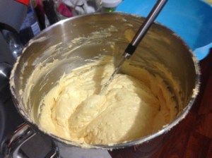 *[I generally use margarine in cakes because a) it’s cheaper, b) it can be dairy-free if you read the labels carefully, and b) it’s already softened, so you don’t have to kick yourself for forgetting to leave it out of the fridge for a day beforehand, like you would with butter. Lately I’ve been taken by Country Soft because they make a buttery spread with buttermilk in it that whips up to a beautiful light yellow when it’s creamed – just like butter! Also good as it comes in lite.]
