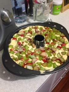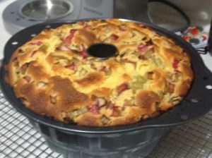 This recipe I came across while searching for a way to use all three of: my new bundt cake tin (Kiwis read: ring cake tin); leftover buttermilk; AND the copious amounts of rhubarb that our plant has produced during the really rainy days last week in Christchurch. While we benefited from the rain, my heart goes out to all those who didn’t have it as good and whose earthquake damage is compounded now by flooding.