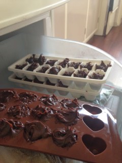 Once removed from the fridge, roll the mixture into balls the size of large marbles, using two teaspoons if it helps. I found that the mixture was still too soft for this, so I filled an ice cube tray and a chocolate mould.