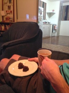 The original recipe suggests using chocolate melts/baking buttons as the entire chocolate component, however I find that even the dark choc kind can be too sweet on their own. Instead, I used semi-sweet chocolate (Whittakers Dark Ghana, mmmmm…) to coat the truffles with, keeping the dark choc buttons as part of the inner truffle mixture. Nathan had no complaints, which is good enough for me!