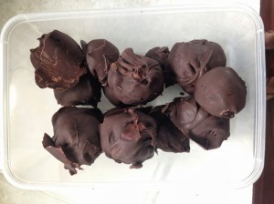 The original recipe suggests using chocolate melts/baking buttons as the entire chocolate component, however I find that even the dark choc kind can be too sweet on their own. Instead, I used semi-sweet chocolate (Whittakers Dark Ghana, mmmmm…) to coat the truffles with, keeping the dark choc buttons as part of the inner truffle mixture. Nathan had no complaints, which is good enough for me!