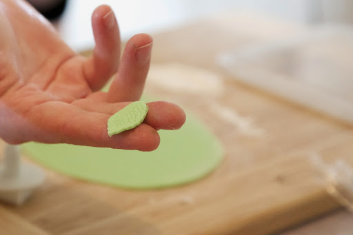 We picked bold red, pastel yellow and green for our tiny s-petal-acular creations (har har!). D showed me how to add a few drops of gel colour to a lump of plain icing and knead it until the colour evened out. We then rolled our icing into the thinnest sheets possible, pressed in the dainty cutters, and the little shapes would fall out onto our palms.