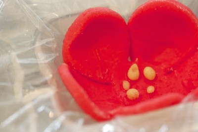 Drop the shaped flower onto the centre of one cube hollow of the cling wrap-covered ice cube – try to ensure that the petals curl upwards. Using a paintbrush, apply a tiny amount (less than a drop) of water to the centre of the flower. Roll some of another colour of icing into tiny balls (each approximately half the size of a pin head) and drop them into the centre of the flower.