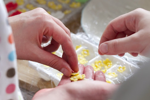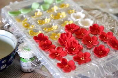 Shaping and moulding flowers happened in the palms of our hands with some clever tools, then we plopped the little guys onto a bed of clingwrap spread over specially designed plastic trays (or ice cube trays if you’ve got them) to dry them out in semi-up-turned positions.