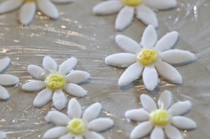 Shaping and moulding flowers happened in the palms of our hands with some clever tools, then we plopped the little guys onto a bed of clingwrap spread over specially designed plastic trays (or ice cube trays if you’ve got them) to dry them out in semi-up-turned positions.