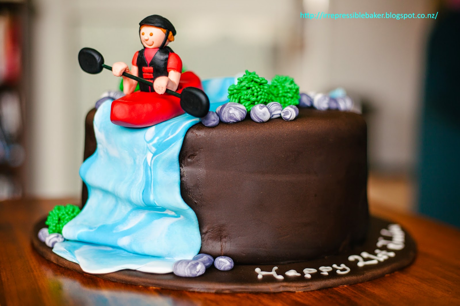 This month I’ve focussed on my first commissioned cake – a 21st birthday cake for the son of a lovely (and very trusting!) friend of mine. According to my friend, a personalised kayaker heading down a fearful waterfall is the epitome of her son’s experience as a professional sportsman. And so I learnt how to make the figurine – my first sugarpaste model ever – and the other decorations from this image that I was given to base the design on: