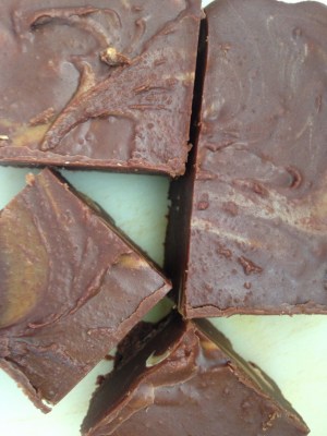 I’m in that category of people who consider that ‘white chocolate’ is an oxymoron so I went without the white when trying to replicate this fudge. Plus I wanted to reduce the melty-ness due to high cocoa butter by introducing sugar on its own. Here’s my version, in which I used smooth, no-salt and no-sugar peanut butter. Add the sugar slowly – if you want to use sweetened peanut butter you may not need as much so just check the sweetness after each half cup of sugar you add. Crunchy peanut butter is another option, especially if you wish to omit the candy or melts.