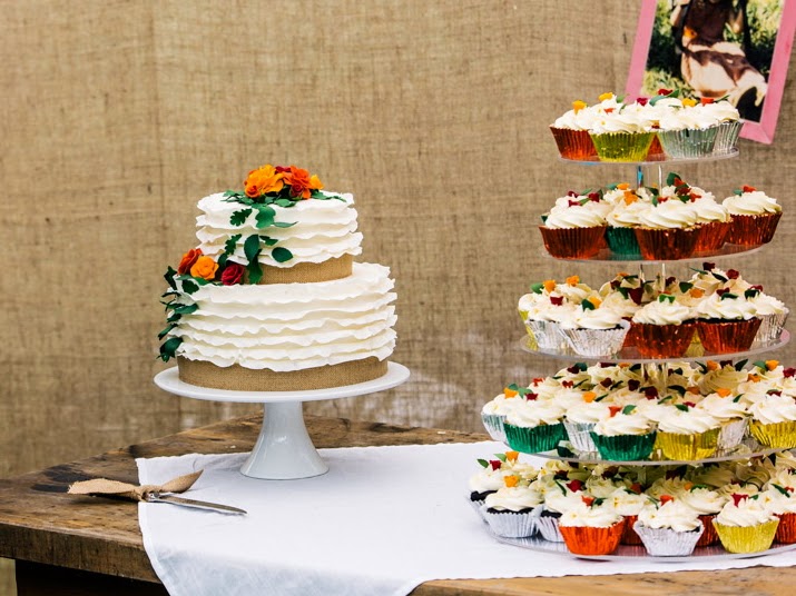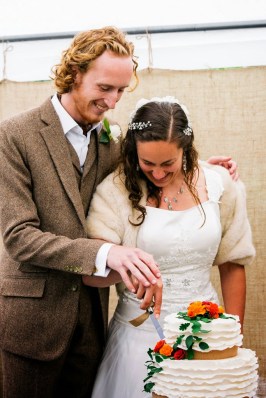 Beautiful photos by Dru and Talia of NOPHOTO show the outcome: a day that drizzled until the last moment (the tent covering threatened with tiny drips to unleash a torrent of captured rain onto the cake table) cleared up for the ceremony then opened up into sunshine for bridal photographs. The bride and groom made a handsome couple in ivory and tweed respectively, flanked by bridal party members wearing the sunset colours of the icing flowers and leaves on the cake.