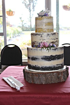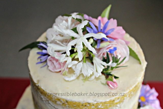 That delightful number was C & K’s inspiration cake for their wedding at ANZAC weekend this year. My third wedding cake ever, this one was to be the most ‘organic’ design – so natural compared to the thick layers of fondant, and less piled-on than the buttercream-slathered look. Naked cakes typically have little shaping done to them, the filling between layers is visible and the barest amount of icing is smoothed around the outside (kind of like a light dusting of snow!). Topped with fruit or flowers, no cake could be fresher!