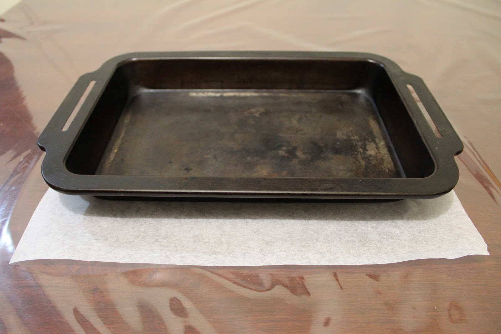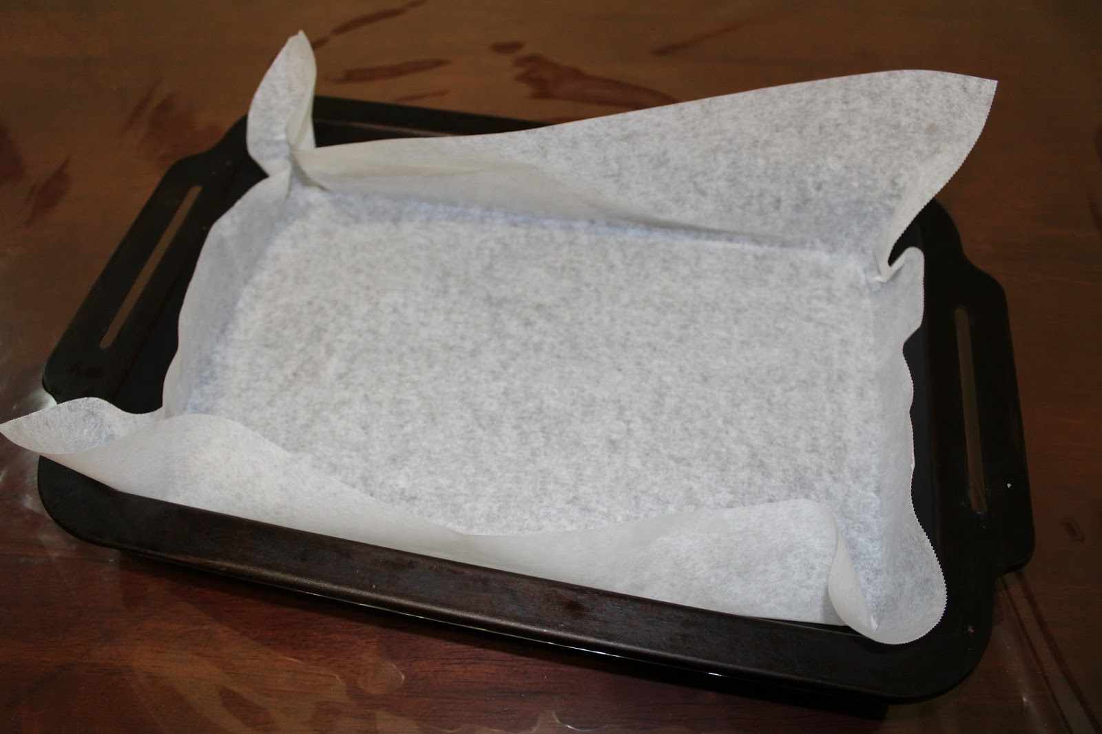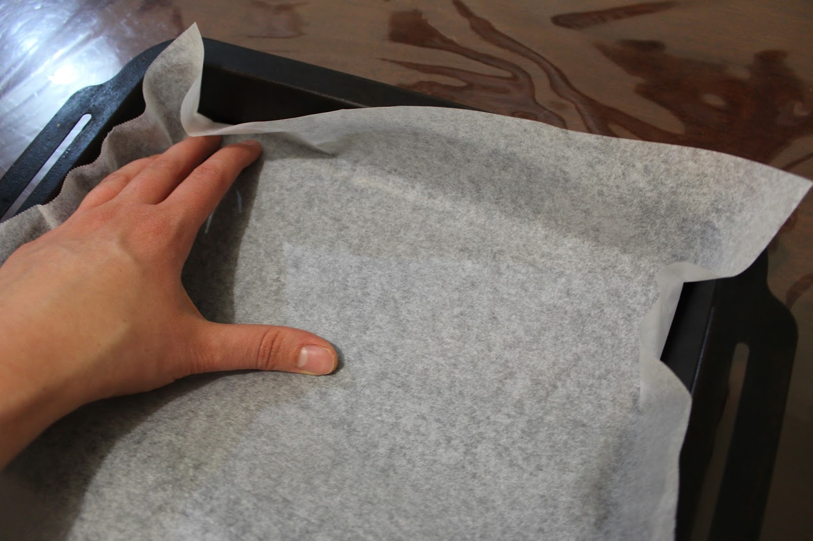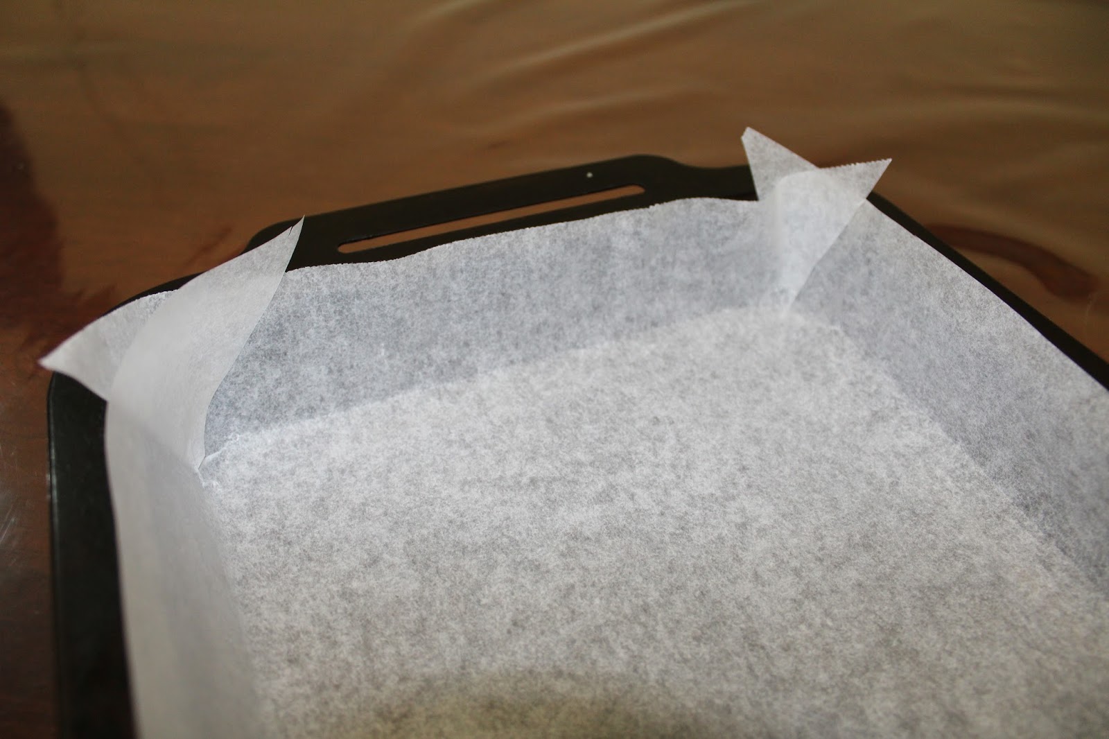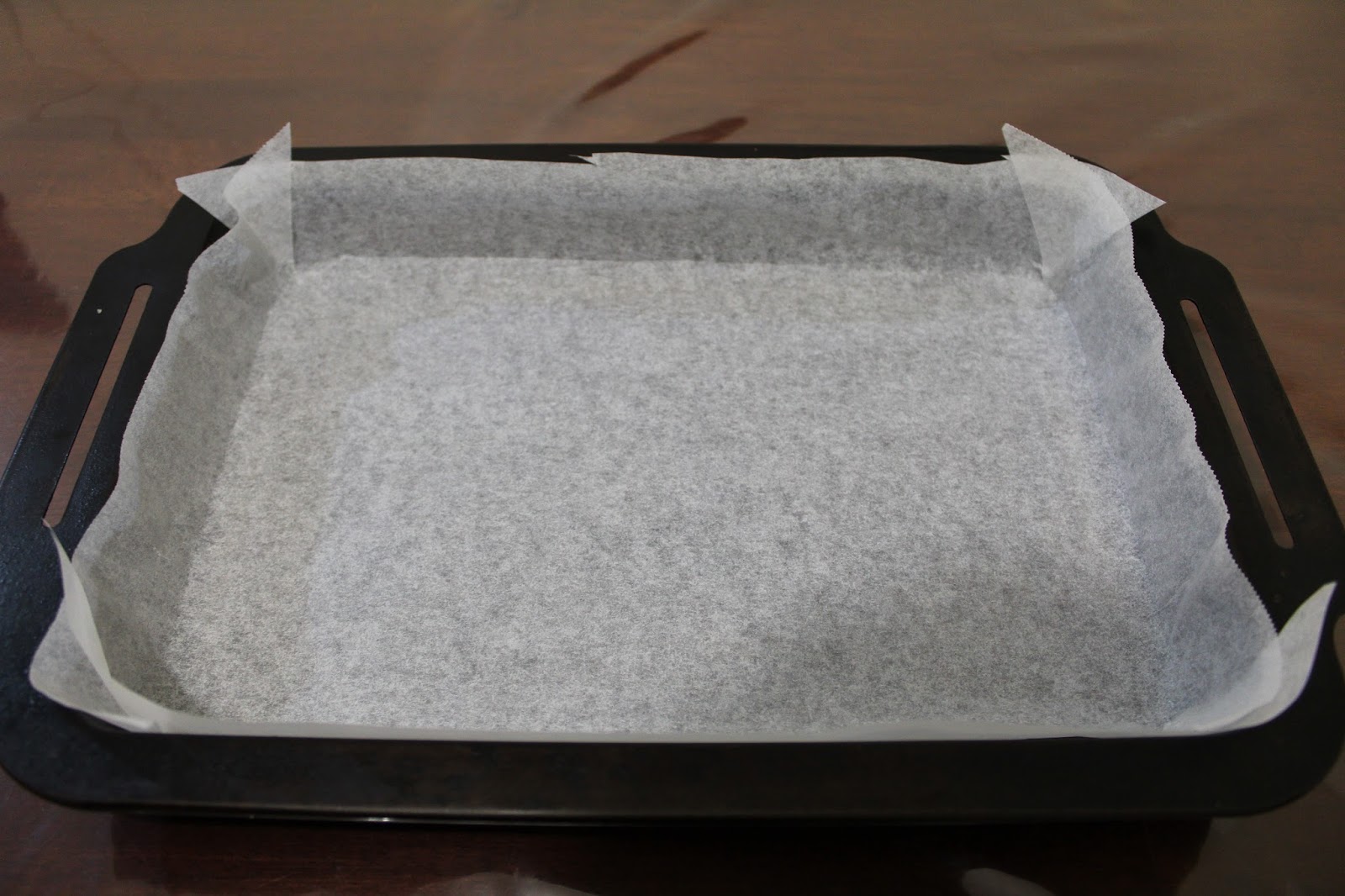 Fit the paper back into the tray and bend the corner flaps so they overlap and fit the corners. You can spray a bit of oil into the tray before lining to help keep the baking paper in place.