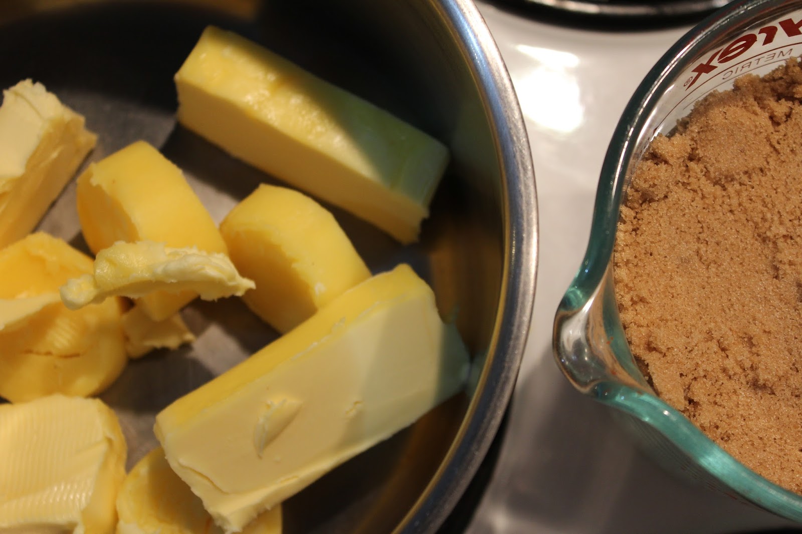 For the blondie, place the butter, caramel and brown sugar in saucepan over a moderate heat.