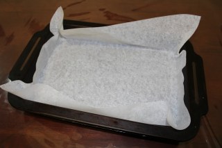 Preheat your oven to 180 degrees C (160 degrees fan bake). Line a 7″ x 11″ (approx) tin with baking paper. Here’s an easy way to do this: cut a rectangle of baking paper wider than the tin…