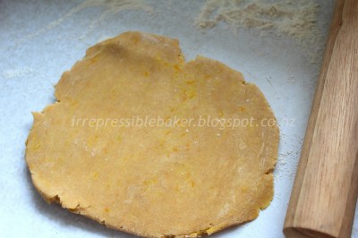 Keep going until the mixture is like fine breadcrumbs. Add the orange zest and spices, using your fingers to combine these ingredients, especially to make sure you don’t get clumps of orange zest. At this point I put the bowl in the fridge to firm up the butter within it again.