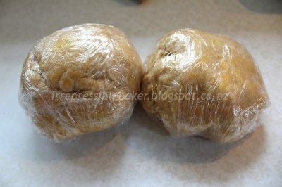 Combine the egg and milk in a small jug/cup/bowl. Make a well in the centre of the butter-flour mixture and pour the milky egg into it. Use a metal spoon to mix together until it gets too thick to continue, then use your hands to work the mixture into a dough by kneading it lightly to combine all the dry crumbs into one ball. Wrap the dough in clingfilm and refrigerate for half an hour.