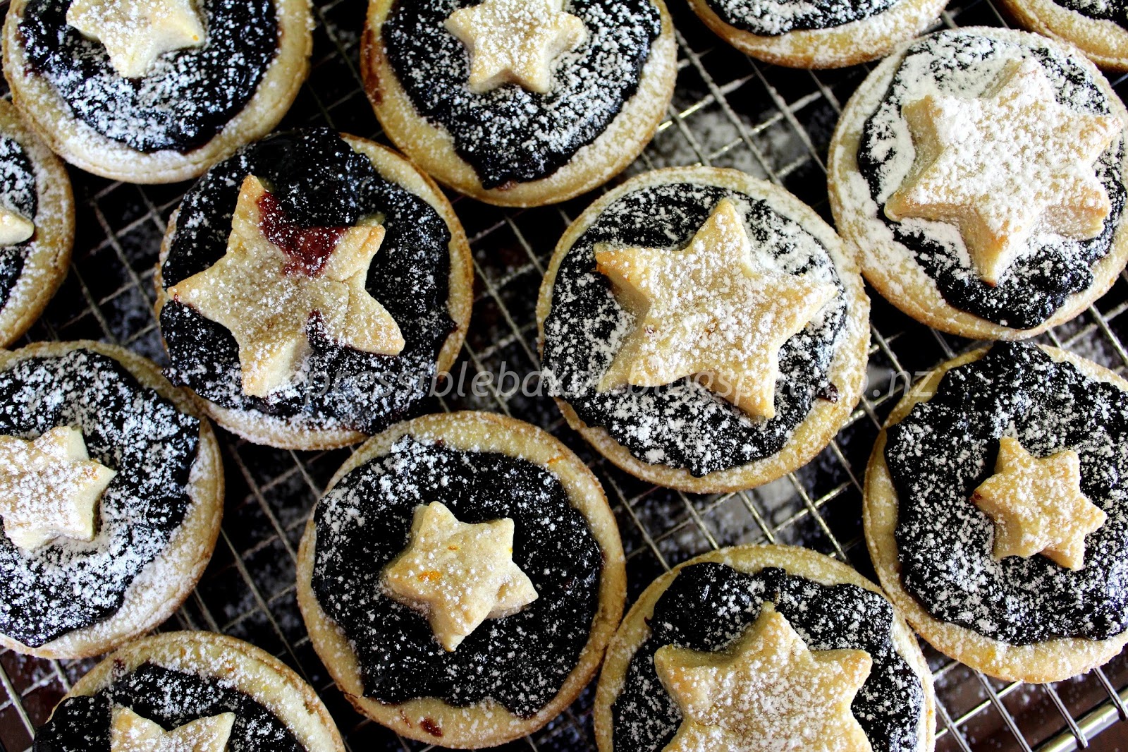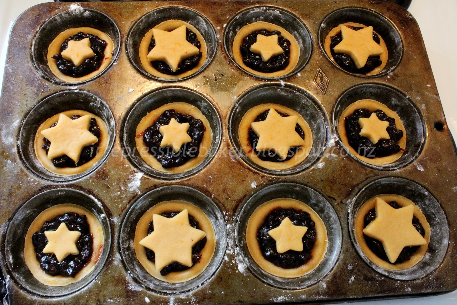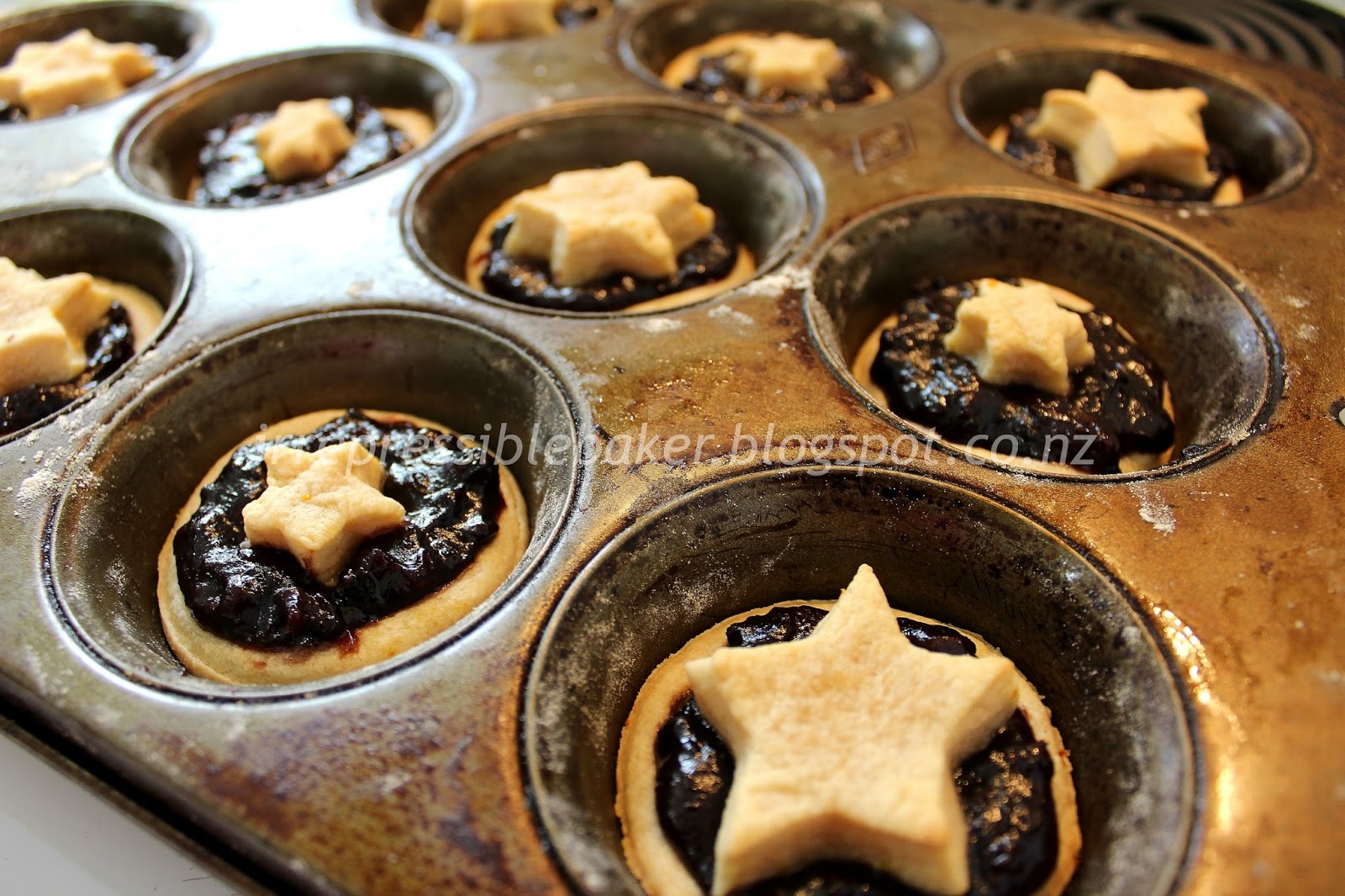 Note: The instructions above produce 12 pies. If using the Anathoth fruit mince, you will have enough mince to make around 18 pies; you can double the pastry ingredients and have enough pastry to make 18 pies with some pastry left over. Alternatively, double the pastry ingredients anyway and cut rounds instead of stars to encase the fruit in the pies, using a fork or your fingers to attach the top rounds to the bases.