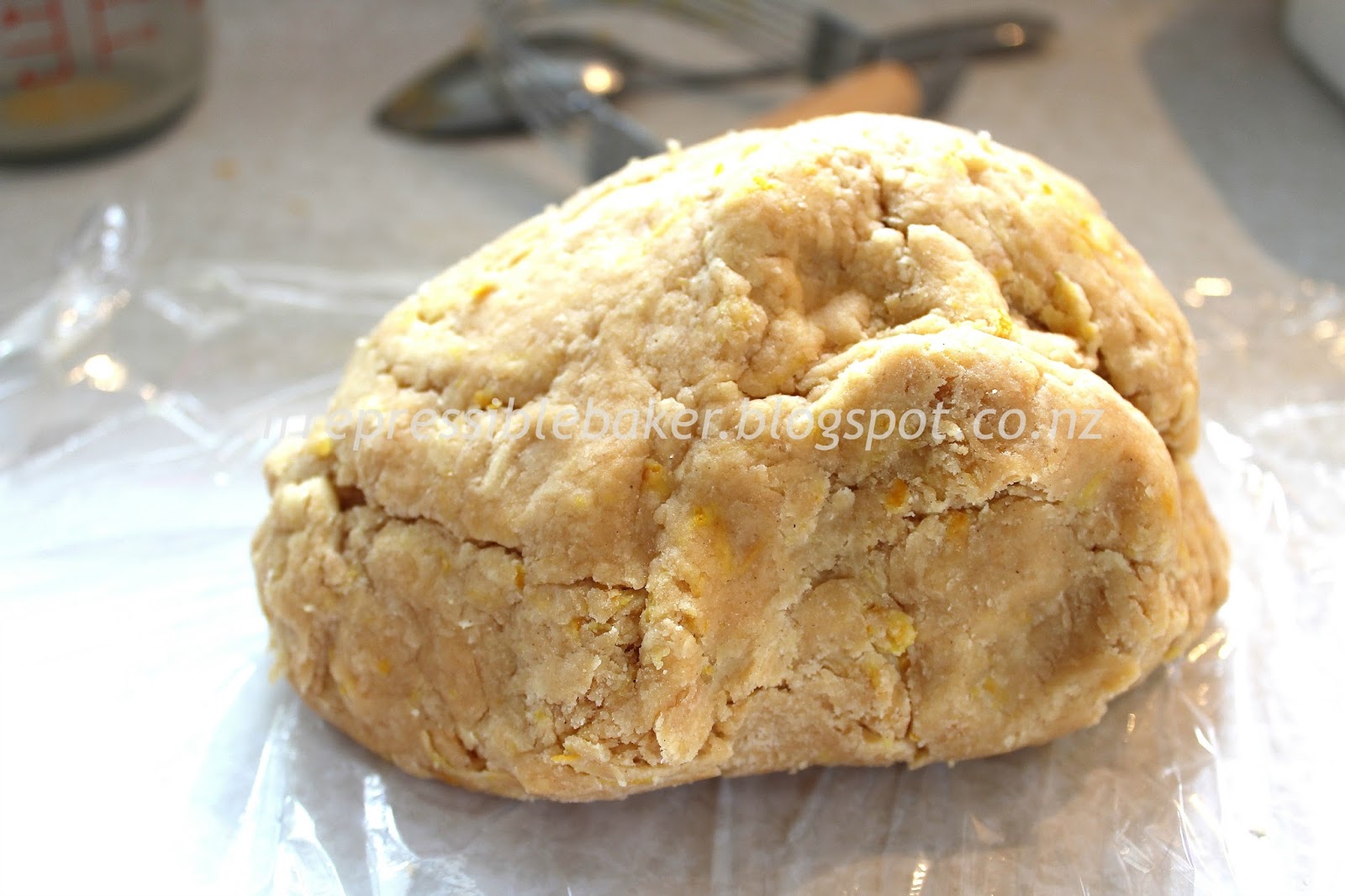 Keep going until the mixture is like fine breadcrumbs. Add the orange zest and spices, using your fingers to combine these ingredients, especially to make sure you don’t get clumps of orange zest. At this point I put the bowl in the fridge to firm up the butter within it again.