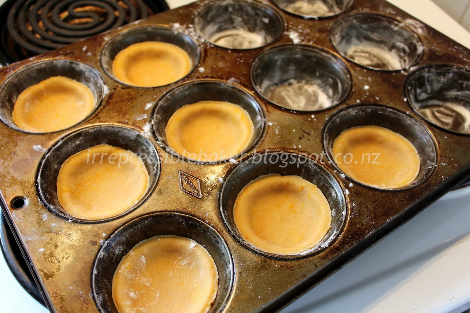 Push each round into each floured muffin/tart cavity – the pastry will only come up the sides a short way.