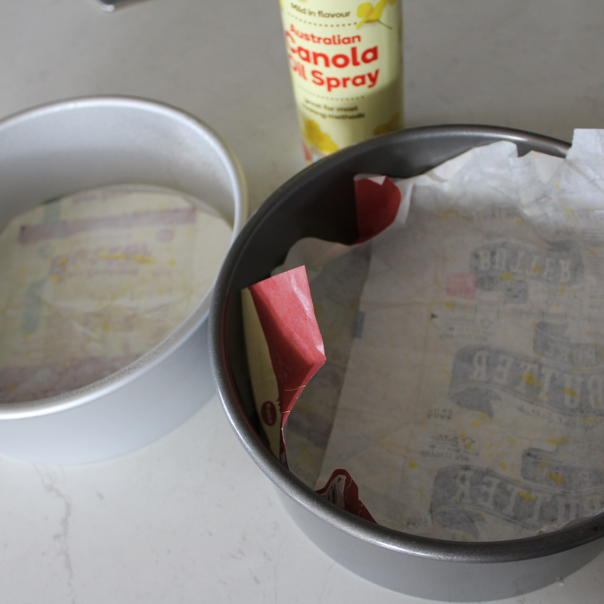 - Preheat oven to 180oC conventional bake. Line two 8″ / 20cm round tins – you can use butter papers if you have them or baking paper, cut to line the base and prevent any batter escaping if your tin has a loose base.