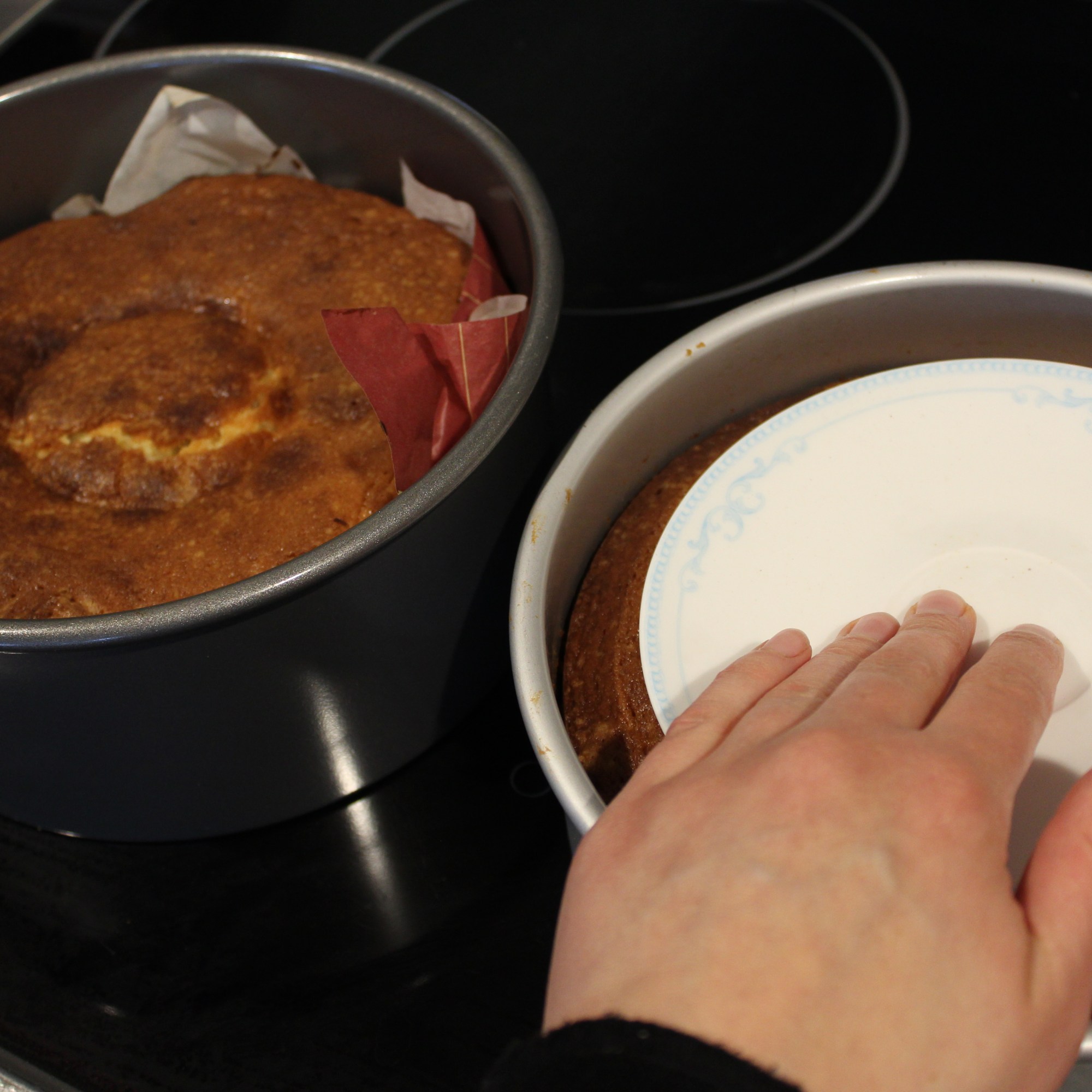 - Cool the cakes until they can be easily removed from the tins (approx. 1 hour) then cool to room temperature – in the second-to-last photo below I’m using the flat base of a small plate to push down the domed centre of a cake while it is still hot, so I don’t need to cut off the top to level it. Cover in cling-film and store in the fridge until ready to decorate.
