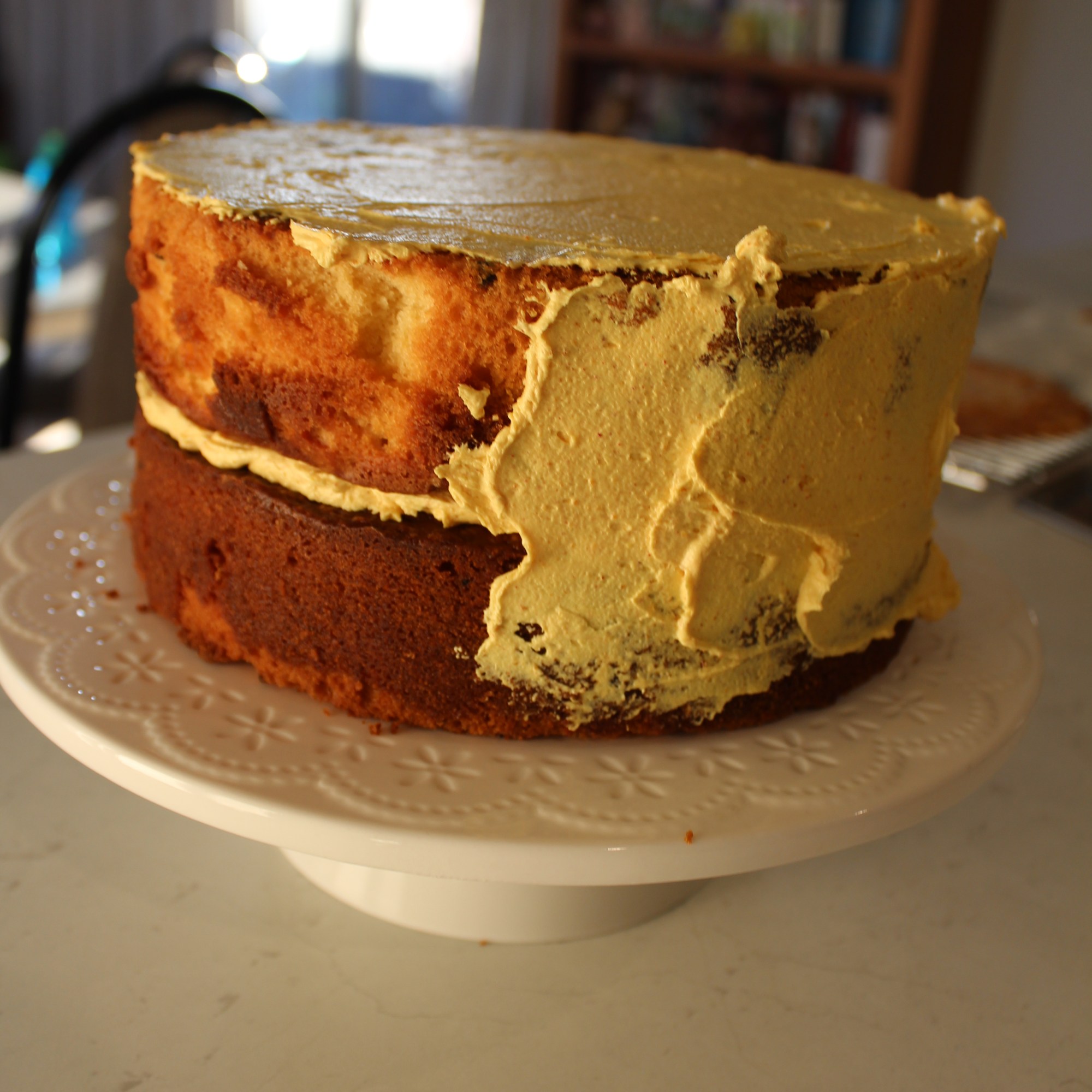See photos below showing filling and ‘naked’ coating the cake with approx. a half batch of Swiss meringue buttercream. If you’d like more detail on how to buttercream a semi-naked cake, the first half of this tutorial might be useful.