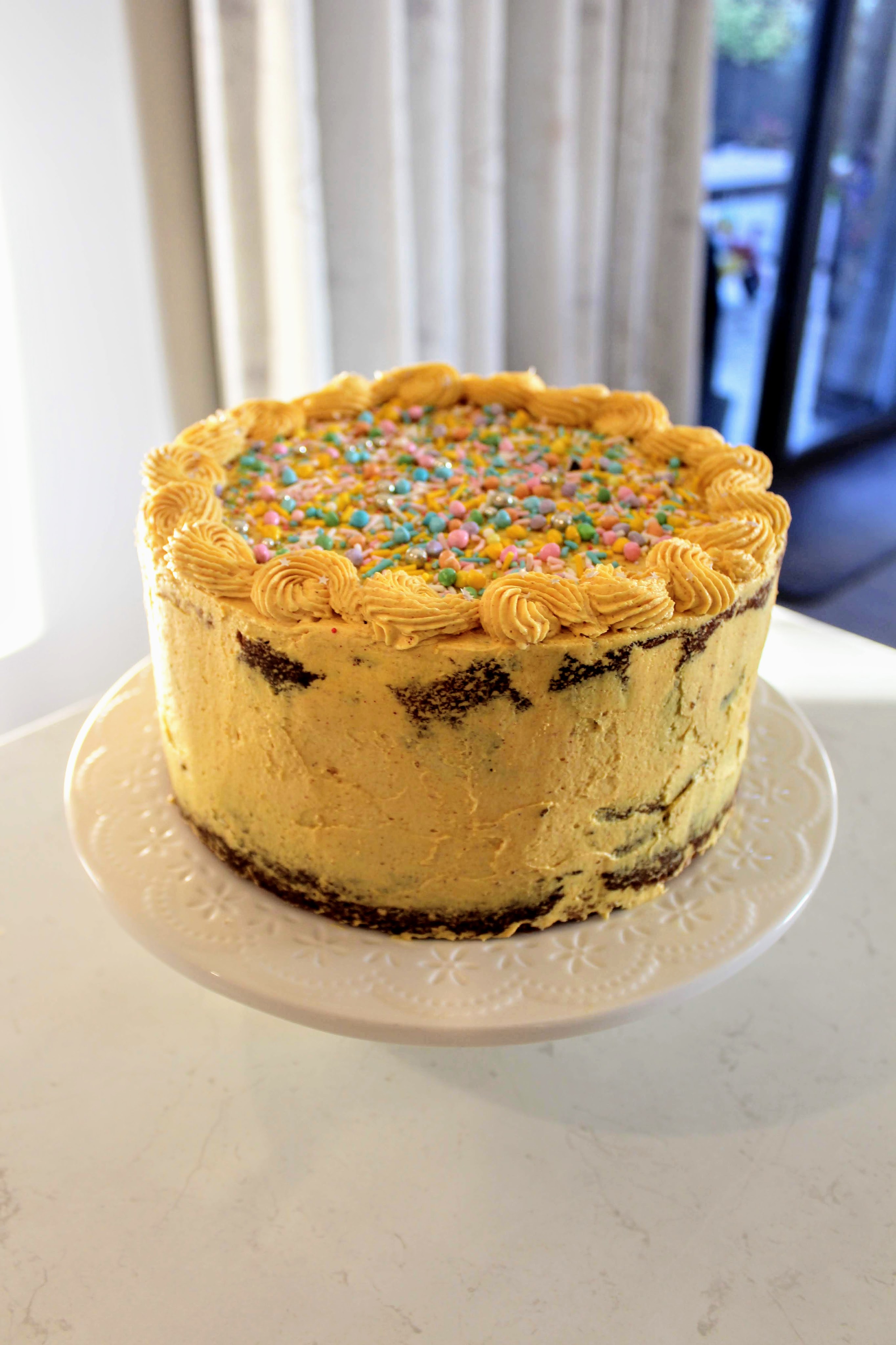 For those swirls I used a Wilton #4B tip, but in future I think I would use the ol’ #1M for a looser swirl. The sprinkles are ones I’ve had from Sweetapolita for long enough that they don’t stock this kind anymore (‘Easter Parade’ I think). If I were to need some more though I’d support my local and buy something like Party Cannon from Sugar Lips! I like the feminine colour scheme matched with the sunny Swiss meringue buttercream icing, which I flavoured with both freeze-dried raspberry and passionfruit. Why isn’t it more raspberry-coloured? Because the icing was actually leftover from the two-year old birthday celebrations… stay tuned to the end of the post to see the yellow monstrosity made for that!