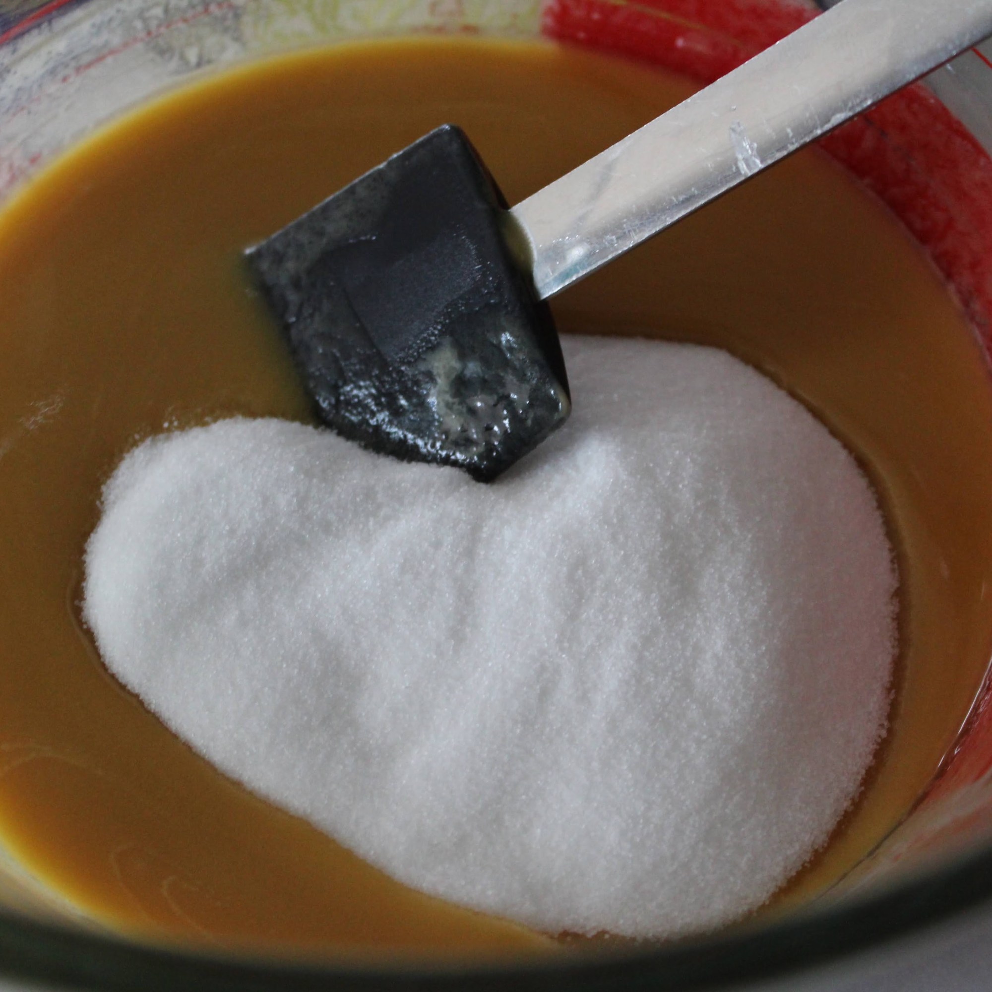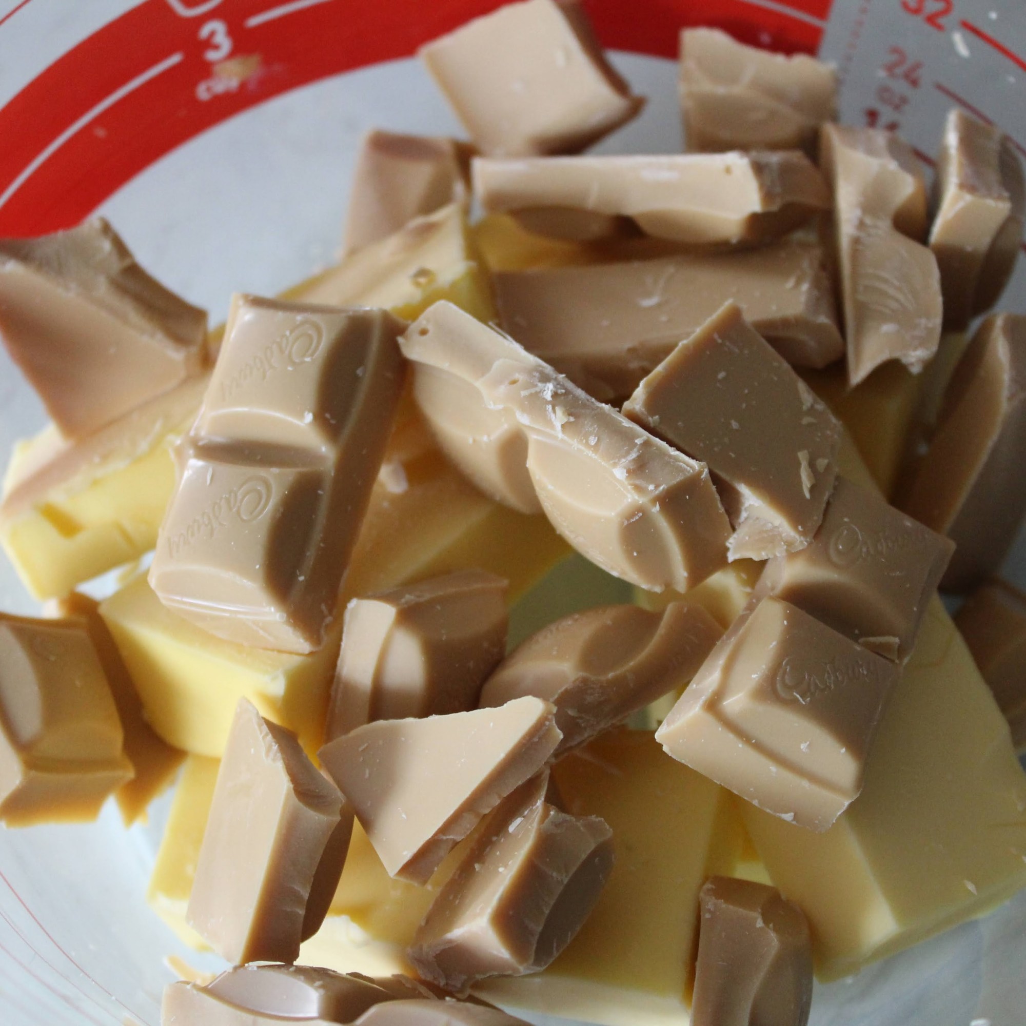 This is a heads up on working with Caramilk chocolate – I’ve found it a wee bit temperamental to melt and combine with other ingredients. Experience tells me this might be due to the caramelisation of white chocolate making it harder to form a stable temper, meaning it ‘collapses’ at higher temperatures. This was quite noticeable when I added sugar to the melted chocolate and butter, causing the chocolate to clump up. I think this was because the fat component of the Caramilk isn’t tightly bound to the sugar in it, and so the two separate easily when more sugar (which would have been slightly cooler than the chocolate) was added. But if someone can correct me on this I would love to know more specifically what’s happening!