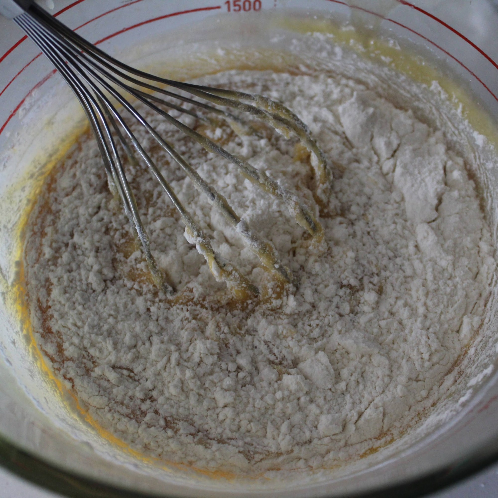 - Sift the flour and baking powder together in a bowl, whisking to combine. Whisk one third of the flour into the chocolate-egg mixture, followed by: half of the milk (or milk and yoghurt), one third of the flour, the remaining milk, and ending with the remaining flour.