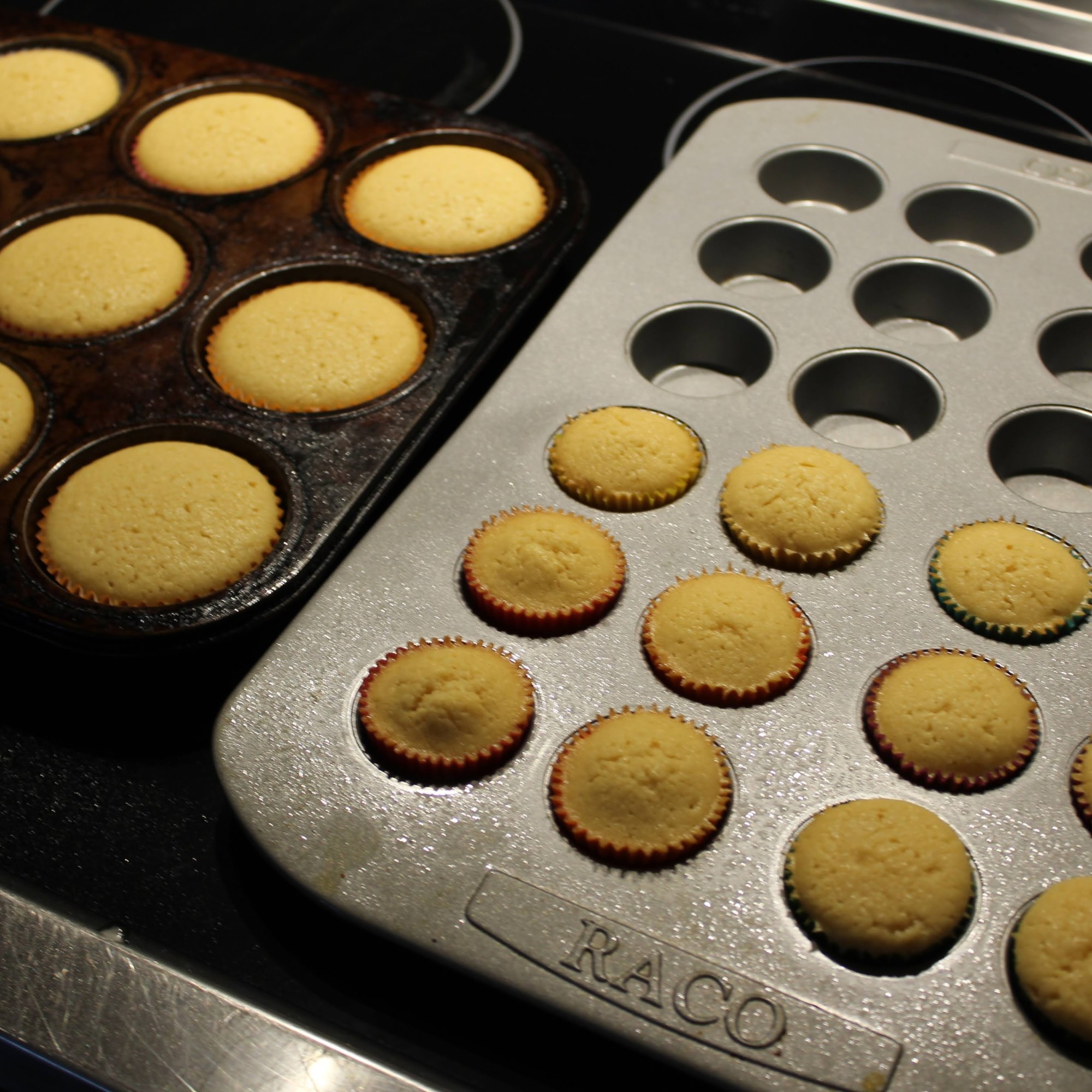 - Divide the mixture between two 12-cup muffin tins or a combination of muffin and mini-muffin tins (see the picture below to show how far I filled the muffin cups, approx. 3/4s full). Bake at 180 degrees for 15 minutes (less for mini-muffins).