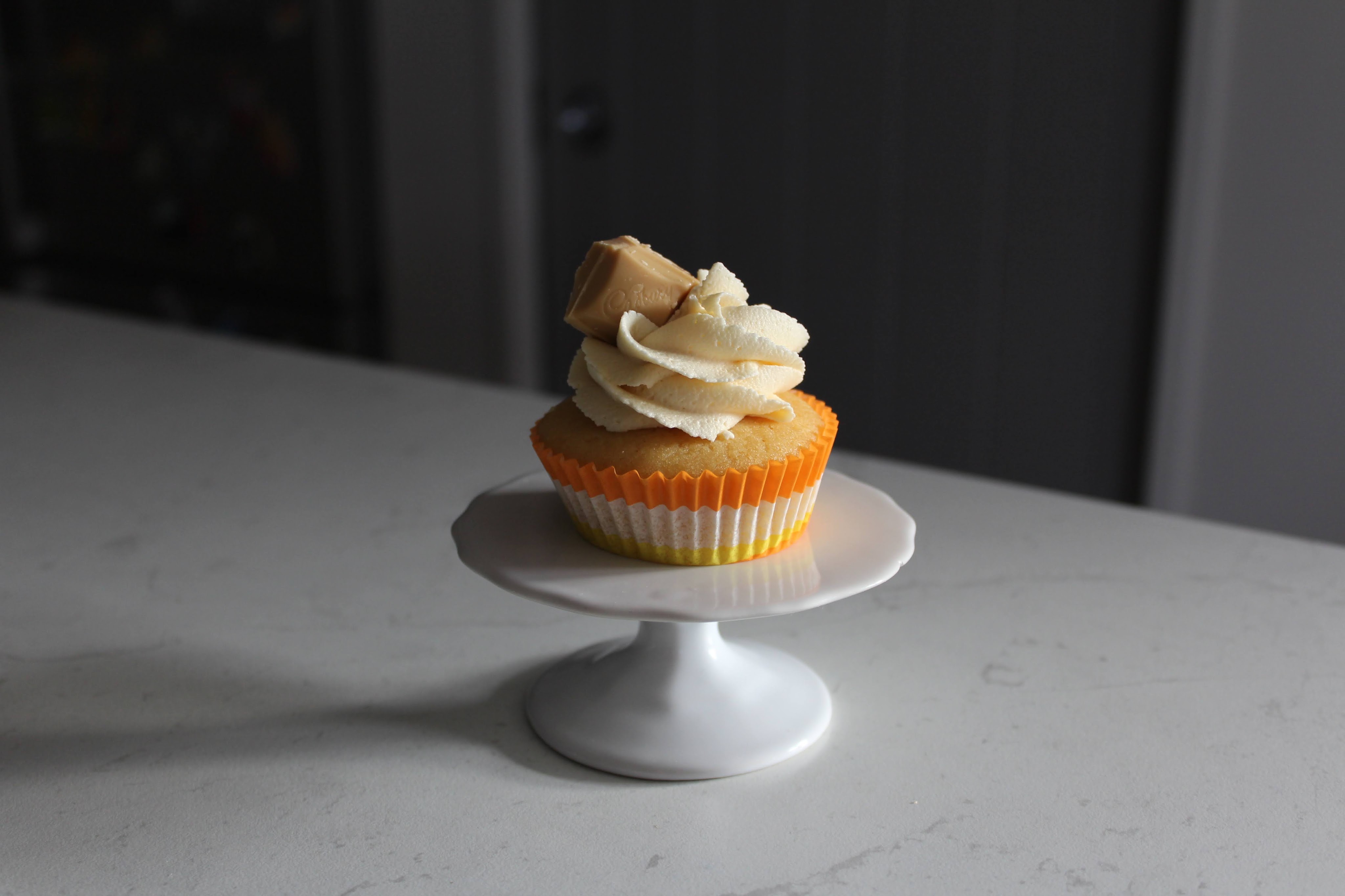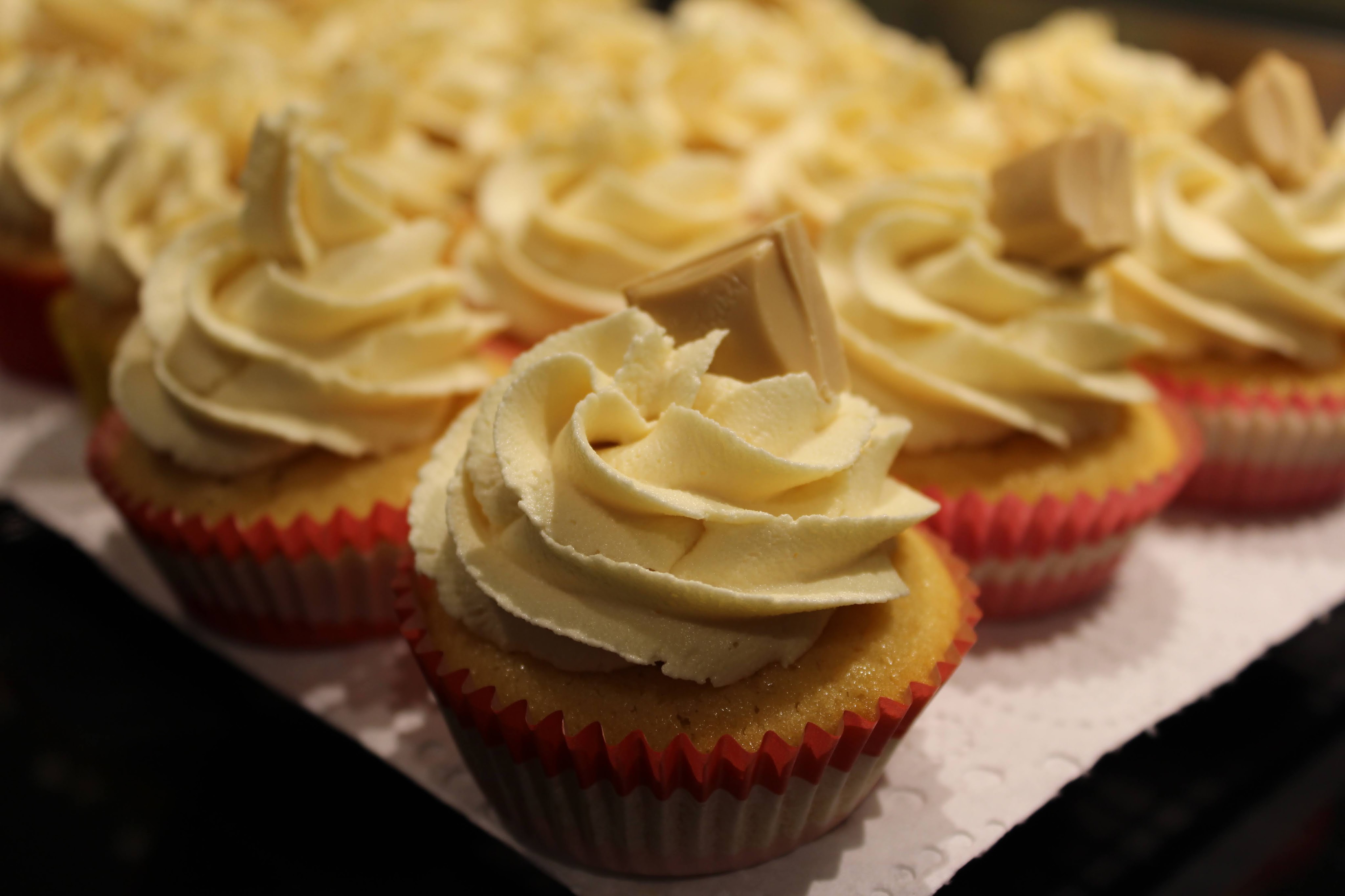 - Using a piping bag fitted with a star piping tip (I used a Wilton #1M) pipe spirals from the outside-in / base-upwards on each large cupcake – and little swirls on the mini cupcakes. Decorate large cupcakes with squares of Caramilk chocolate. Store