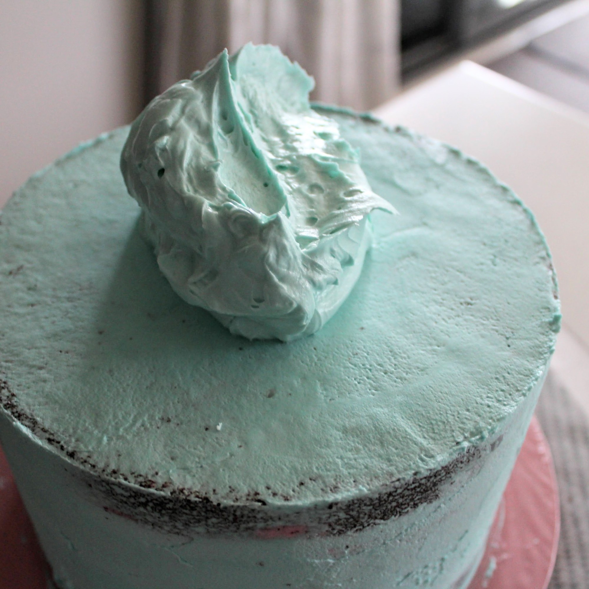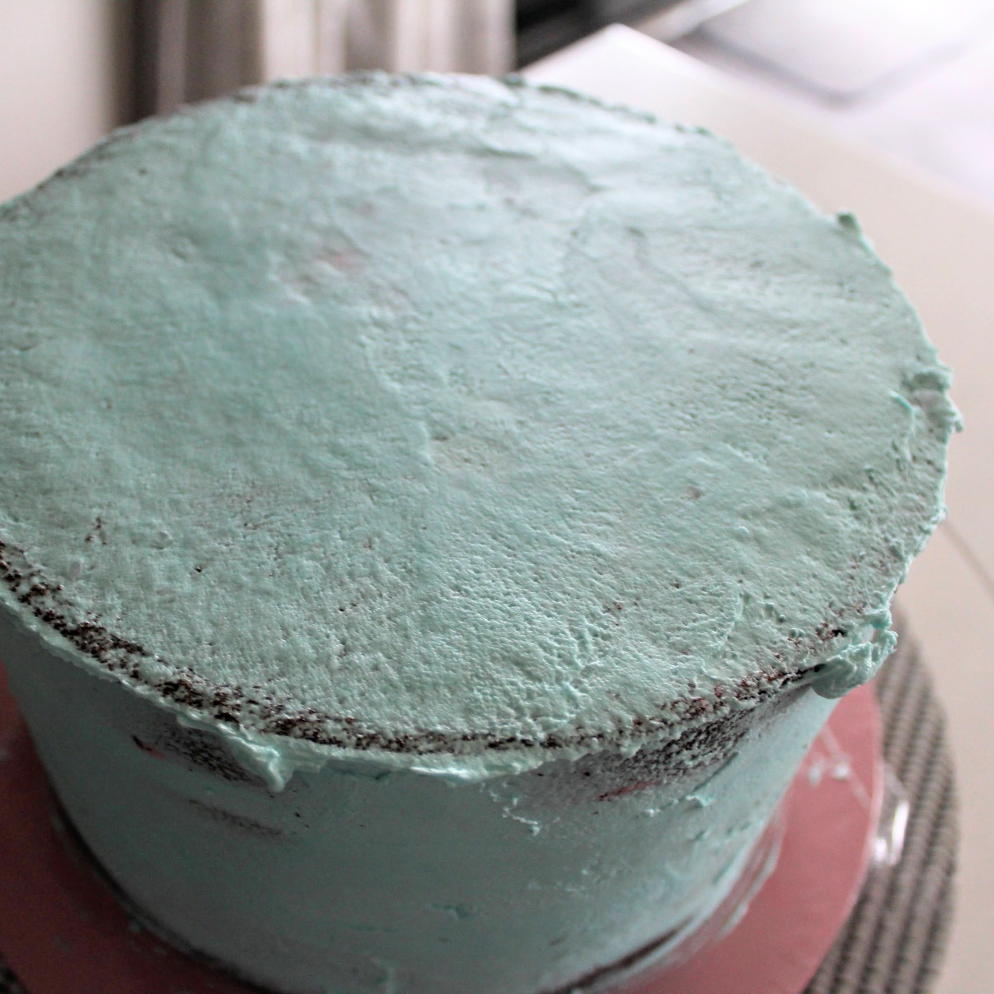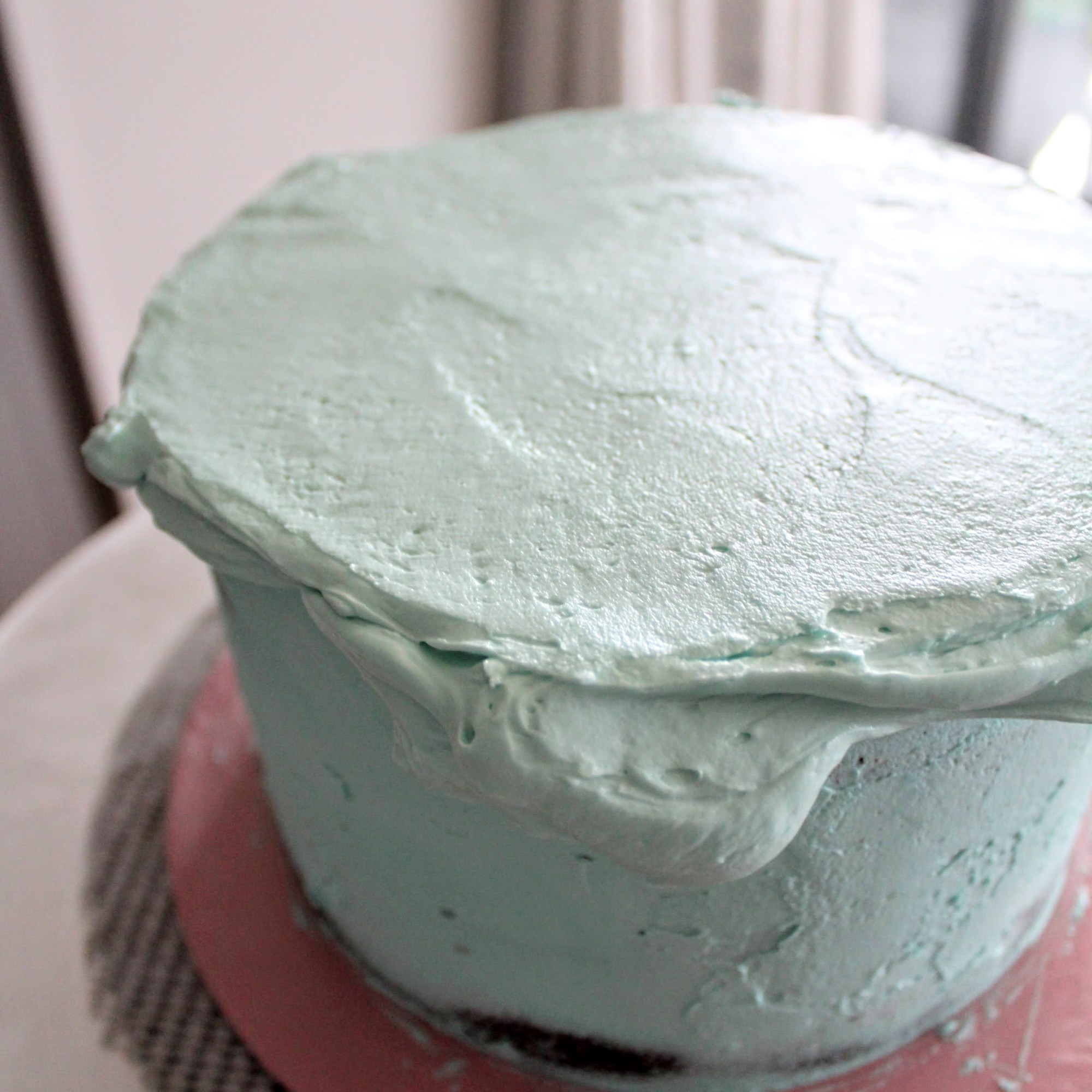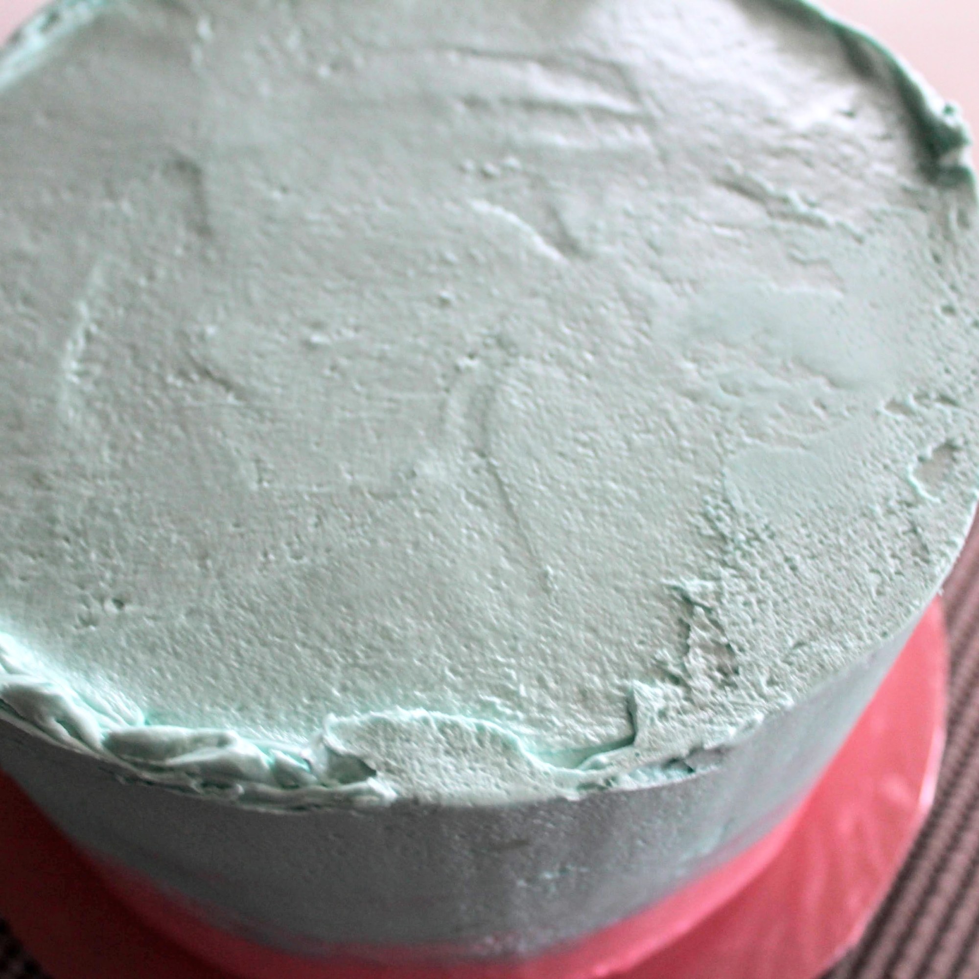 - After stacking and filling the cake layers, I crumb-coated the cake all over in a thin layer of the blue buttercream {photos 2-4}, refrigerating until firm.