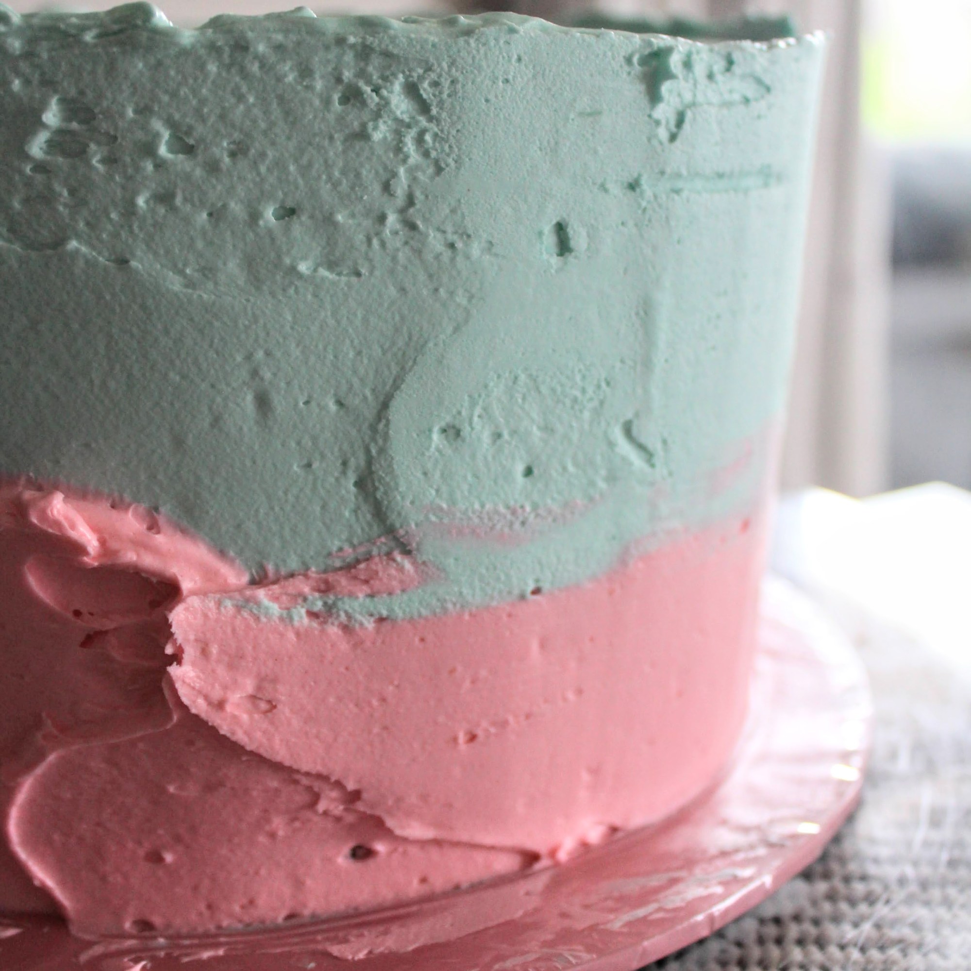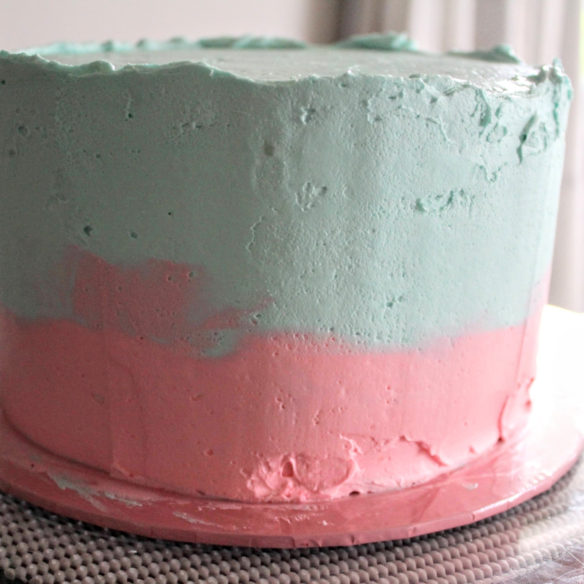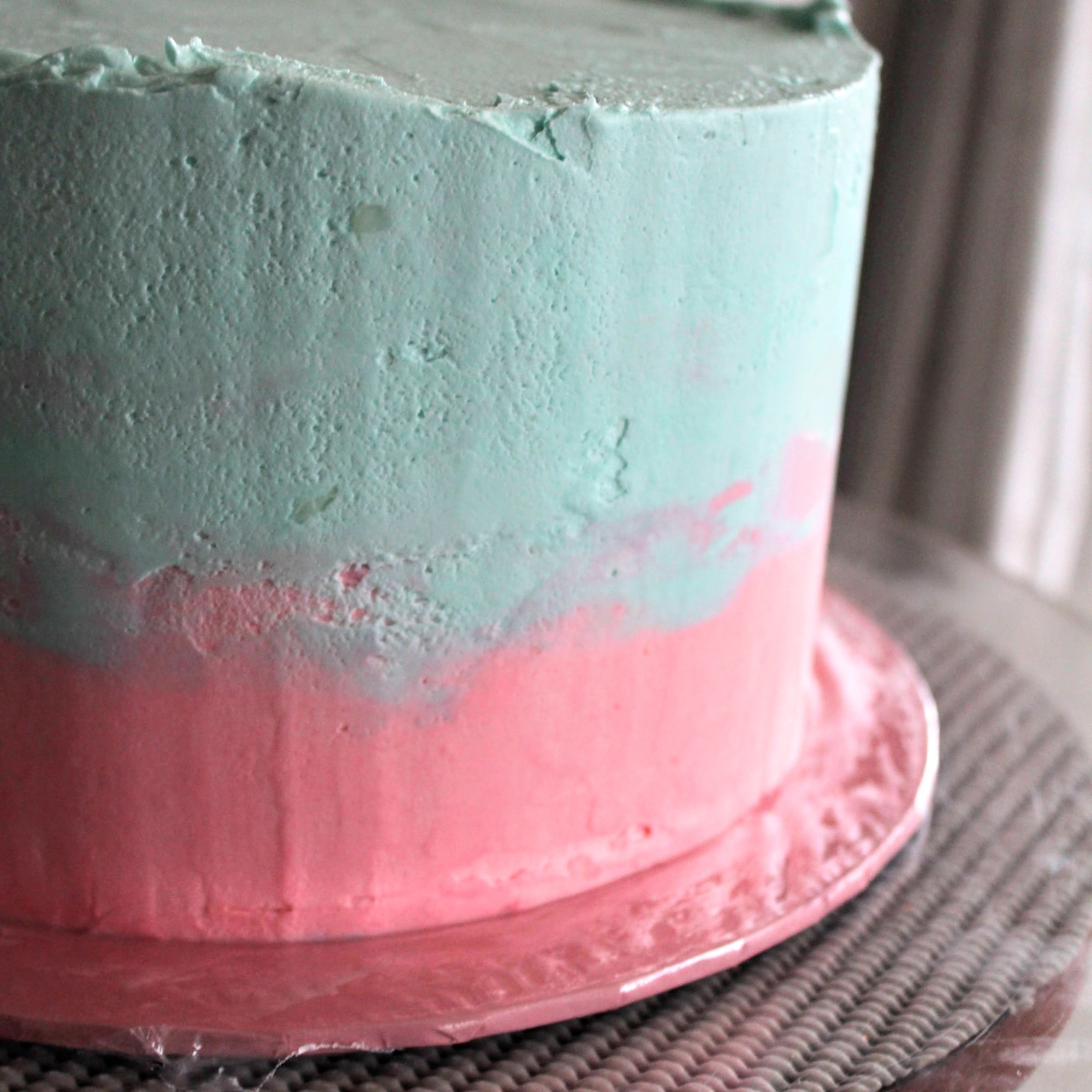 - For an 8″ round cake approx. 4 1/2″ tall, I prepared a double batch of Swiss meringue buttercream) and coloured around half of it sky (ocean) blue and the other half pastel pink for my ombré shades.