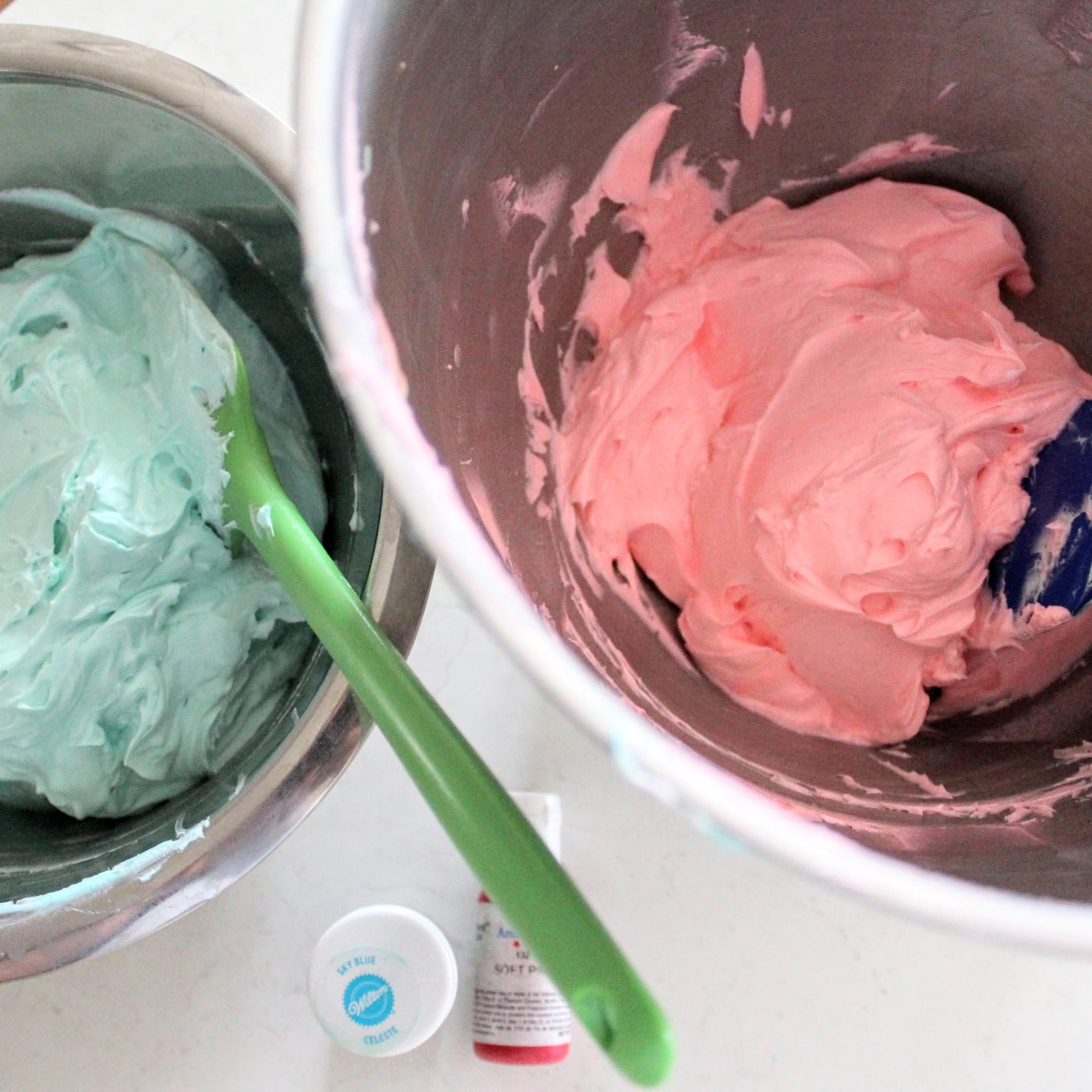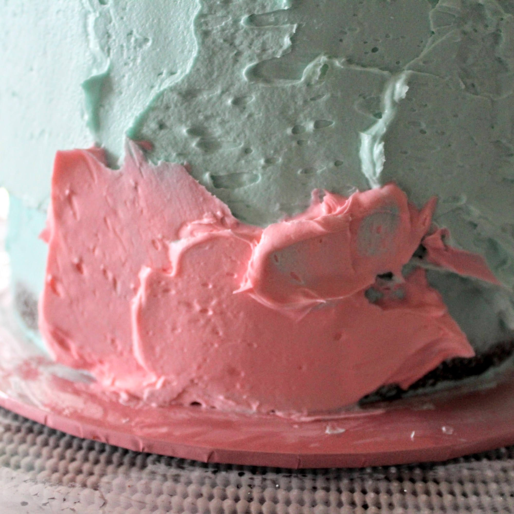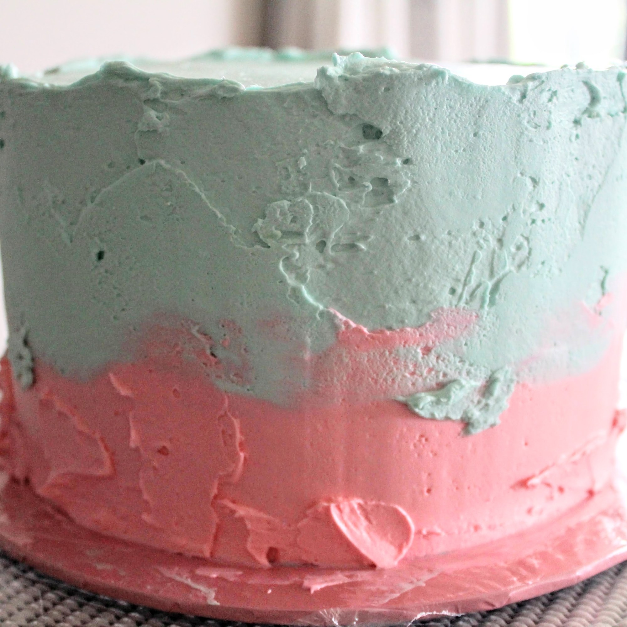 - For an 8″ round cake approx. 4 1/2″ tall, I prepared a double batch of Swiss meringue buttercream) and coloured around half of it sky (ocean) blue and the other half pastel pink for my ombré shades.