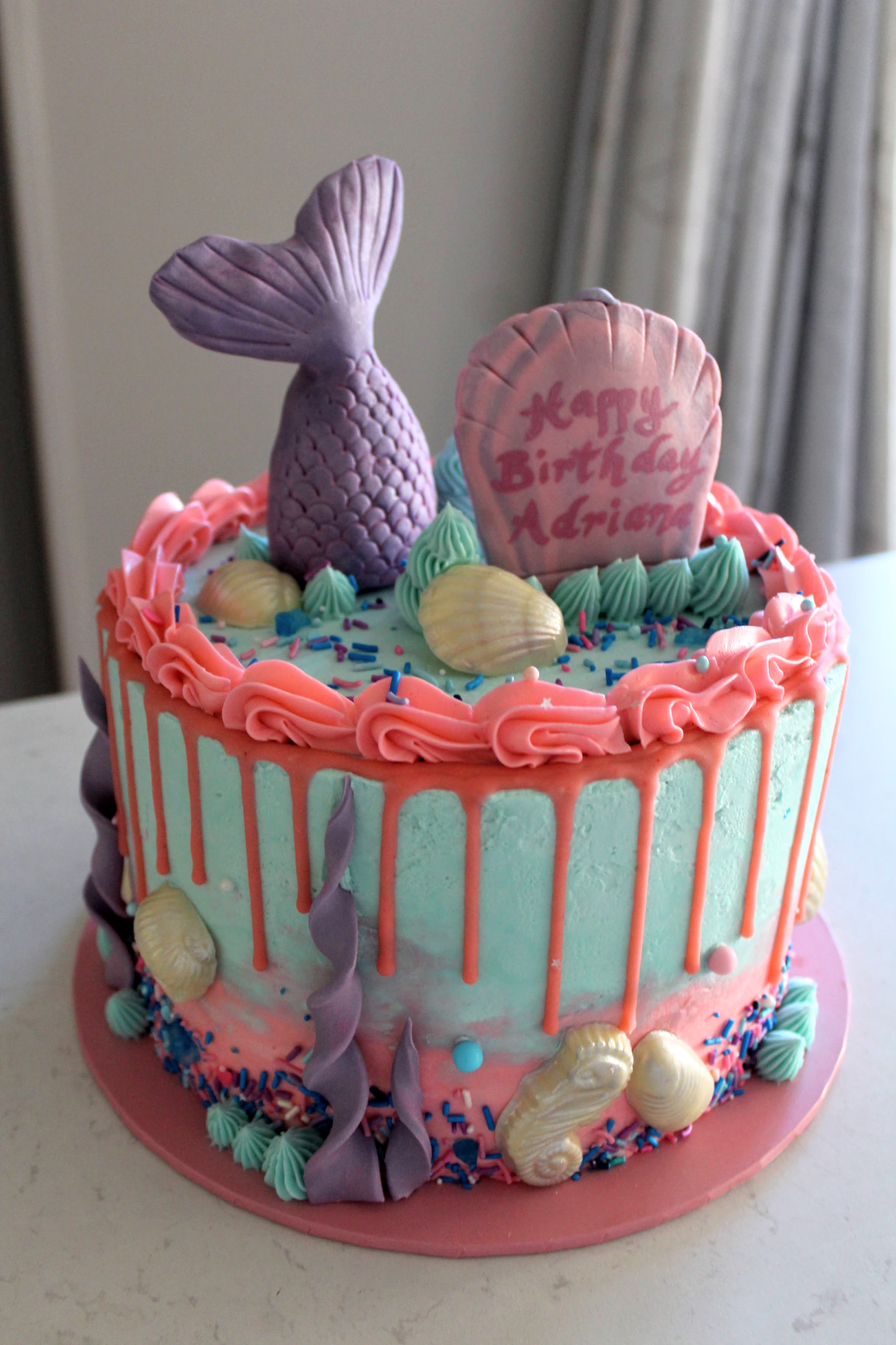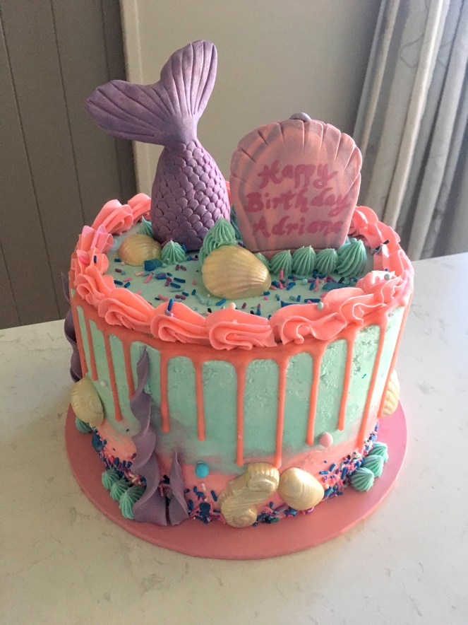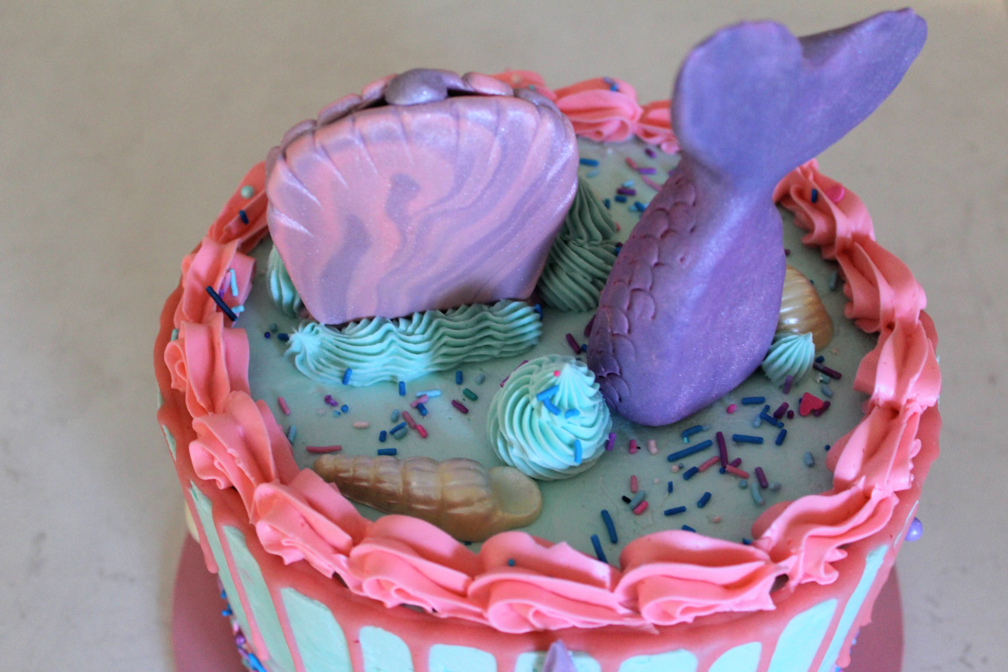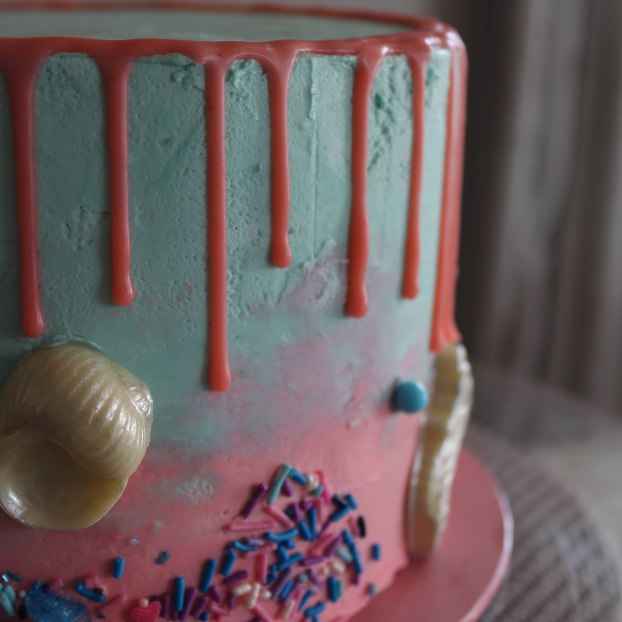 The brief was nice and flexible, with the special birthday girl wanting her mermaid dreams to come true with lots of pink! As well as some example photos sent by her mum, I found heaps of useful inspiration pics just by searching for images on Google. I tried to keep things simple with just a few fondant decorations (clam shell, mermaid tail and coral) and sea shells made in a mould with white chocolate. A little glitz goes a long way, and once these items were painted with shiny edible lustre dusts I felt like the cake was ready for ‘party mode’!
