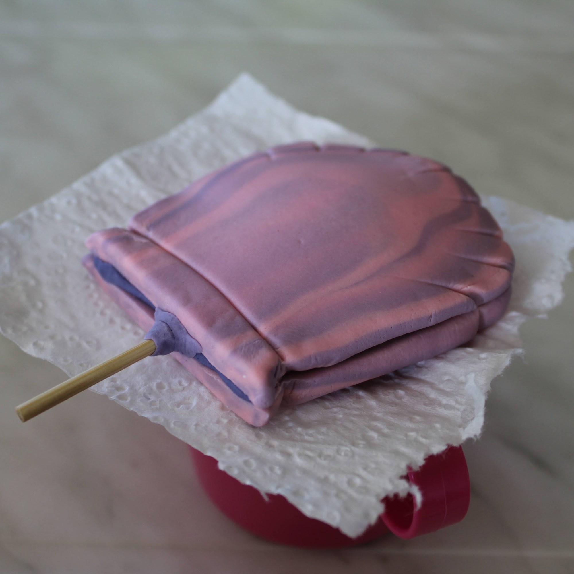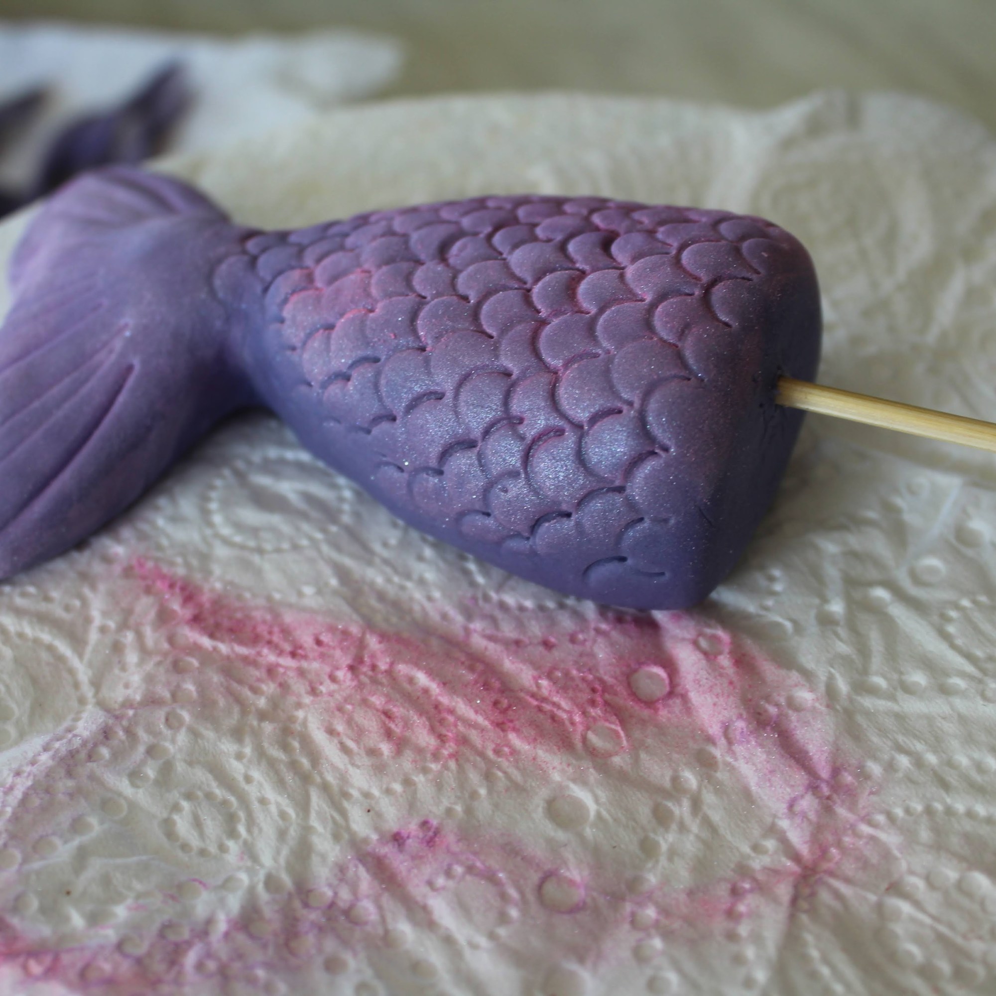 - For both the mermaid tail and clam shell, I mixed some tylose powder with Pettinice solid fondant icing, then shaped it around wooden kebab skewers before it dried. To give it a domed look I set the clam shell halves over half-sphere silicone moulds until mostly dry before gluing them together, adding a ‘pearl in the top’ and some soft fondant at the base around the skewer {photo 4 below} to help adhere them. When dry, I dusted these both with a combination of hot pink, purple and shiny pearl lustre dusts.