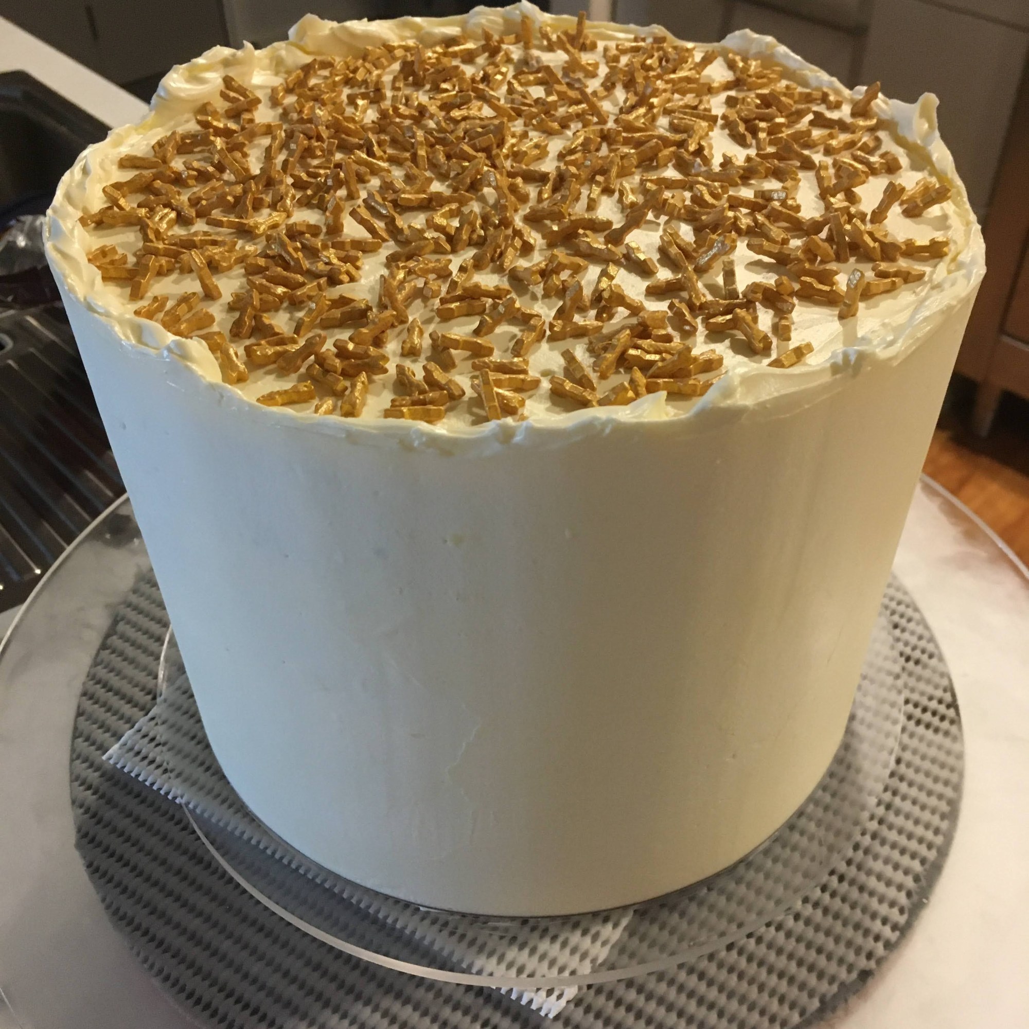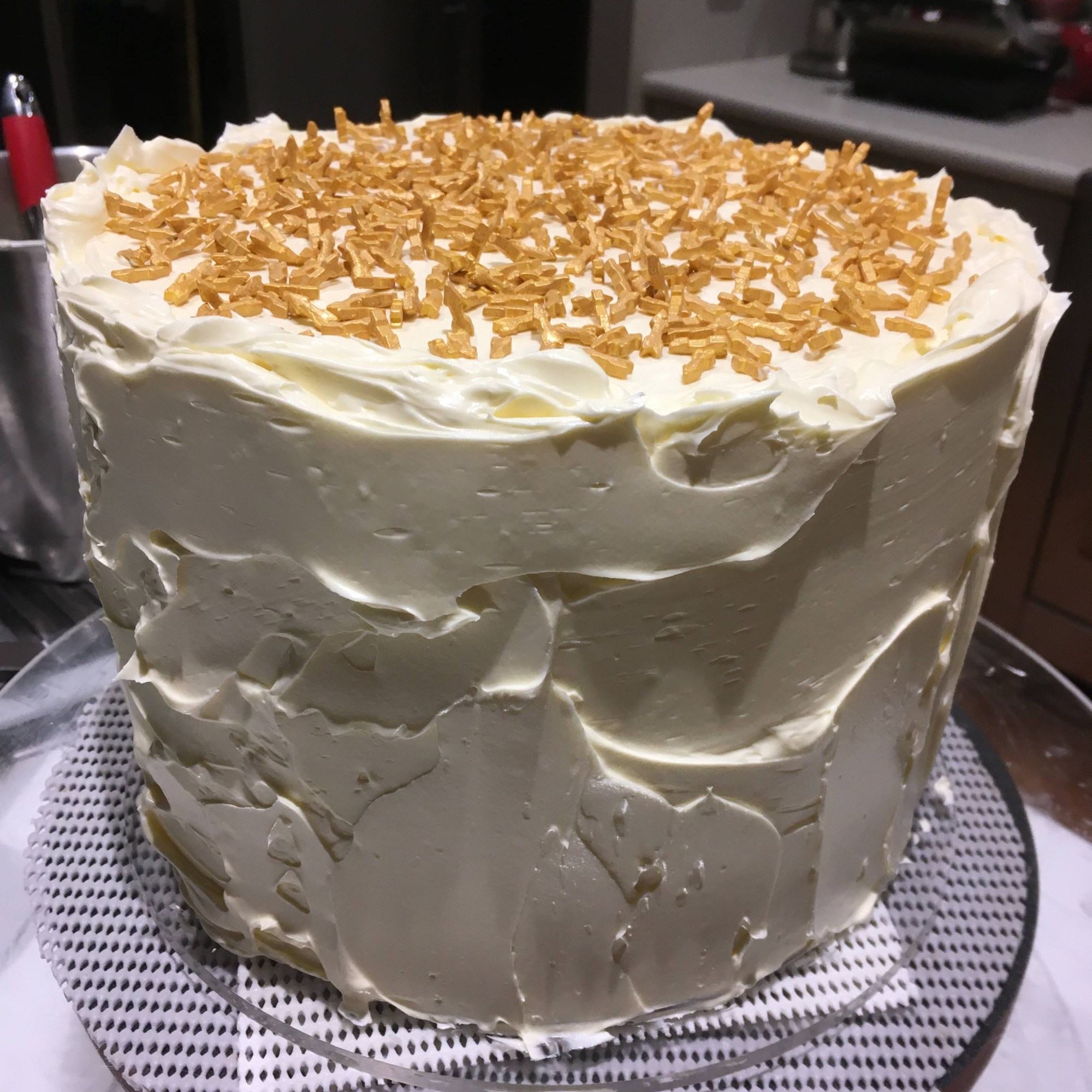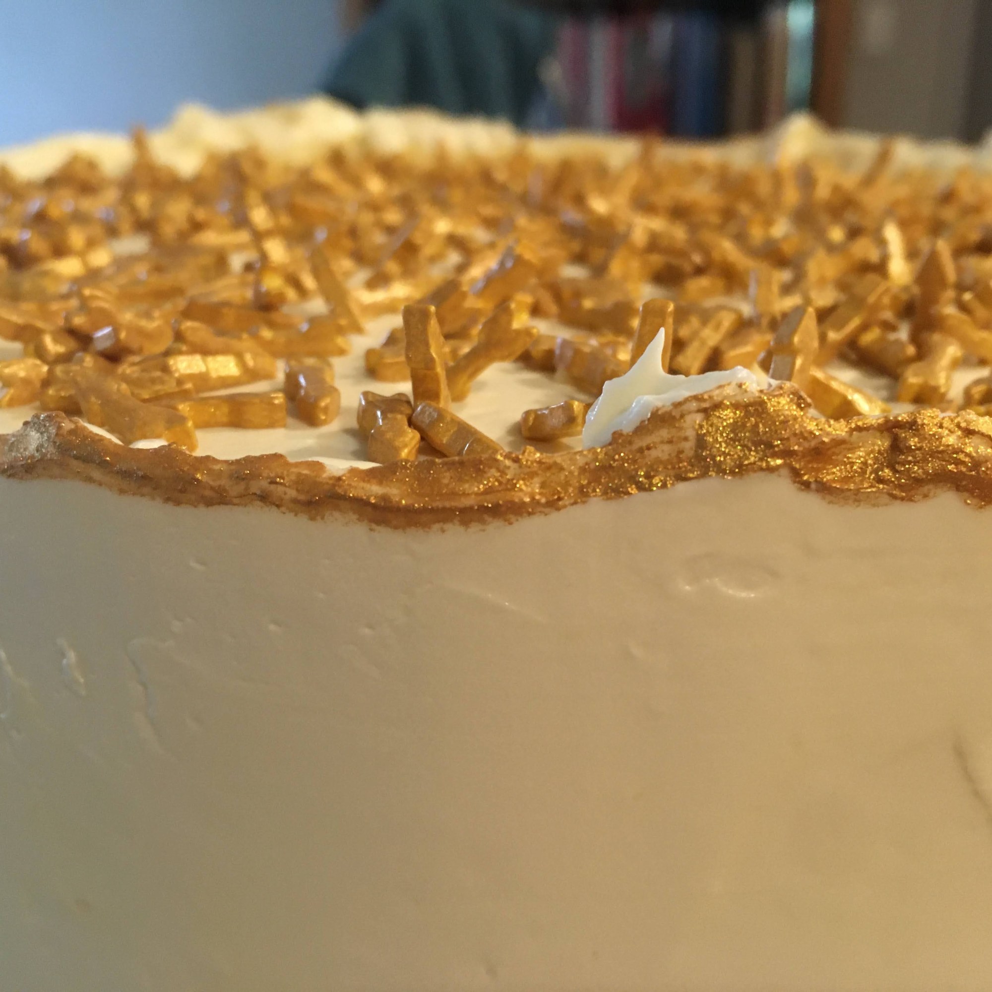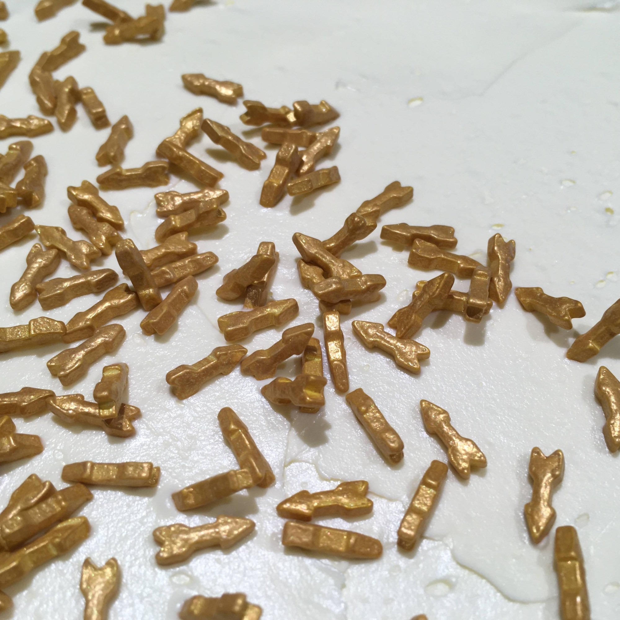 If you’ve read this far and you’re curious about the cake decorating process, see below! I went for a rough top edge with the buttercream, which I painted with gold lustre dust plus decorator’s spirit onto the chilled iced cake. I used the same mixture to make the arrow pattern on the side of cake, by painting a wooden kebab skewer with the gold dust mixture and pressing onto the cake to form the arrow shafts (the arrow head shape came from a plastic furniture corner protector!) Speaking of the side, that smooth cake exterior took several goes with my metal scraper, filling in the holes in between scrapes. Arrow sprinkles(!!!) from Spotlight 🙂